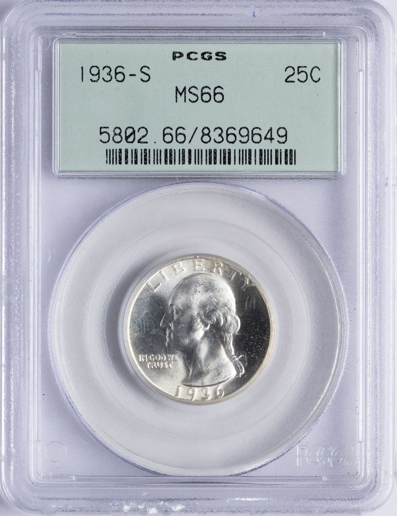 One 1936-S Washington Silver Quarter Coin PCGS MS66.