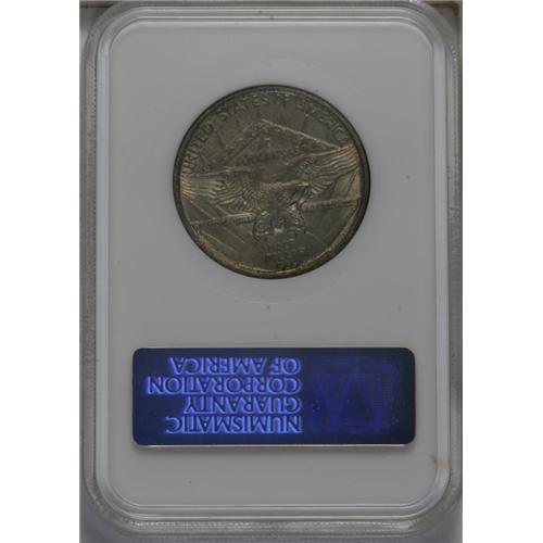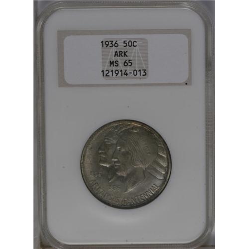 <B>1936<img border='0' src='http://www.heritagecoins.com/images/star.gif' width=10 height=10>ET> Arkansas PDS Set MS65 NGC.</B></I> The set resides in older NGC holders with consecutive serial numbers, and includes: <B>1936,</B></I> deep powder-blue and olive toning, a small mark on the Indian's cheekbone; <B>1936-D,</B></I> richly toned khaki-gold, dove-gray, and lime, a clean reverse; and a <B>1936-S,</B></I> fully patinated in lavender and chestnut blends.