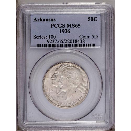 <B>1936<img border='0' src='http://www.heritagecoins.com/images/star.gif' width=10 height=10>ET> Arkansas PDS Set MS65 PCGS.</B></I> The set includes: <B>1936,</B></I> a sharp strike with brilliant and frosty silver luster; <B>1936-D,</B></I> fully struck with frosty silver luster and pale brown toning over half of the obverse; and a <B>1936-S,</B></I> sharply struck and fully lustrous with brilliant and frosty silver surfaces. <BR><BR><B>Important notice:</B> Heritage usually auctions material at the rate of 200-250 lots per hour. On some occasions eBay Live bid software or the Internet may not be able to keep up with the pace of the auction. We recommend placing a realistic absentee bid now as insurance to avoid disappointment. Occasionally the auctioneer may eliminate or reject an eBay Live bid, and the auctioneer may also reopen a lot after the close of the eBay live bidding (usually because we missed an audience bid), and may reject your bid even if it shows you as the winning bidder. By bidding via eBay Live, you agree that Heritage may award the lot to another bidder at its sole discretion under the circumstances described above or any other reasonable circumstances. Since eBay bids are not shown to us until we open the lot on the floor, we treat those bids just like floor bids. In most cases the floor responds before the eBay bid is presented to us, due to Internet lag time, so for consistency we have made it a policy that floor bids are always considered first over tie eBay live bids. Also please note that all Heritage lots purchased through eBay Live carry a 20% Buyer's Premium. Please make sure you read the Terms and Conditions before you bid. This lot is being auctioned in conjunction with a live floor auction by Heritage Galleries & Auctioneers. All final auction and invoice information will be supplied by Heritage Galleries & Auctioneers, and all other information should be considered preliminary. Lot:4861 <BR><BR><B>Winning Notification and Billing:</B> After the FINAL session in this auction is complete, Heritage will send e-mail and snail mail invoices. This process normally takes several days. All final auction and invoice information will be supplied by Heritage Galleries & Auctioneers, and all other information should be considered preliminary. <BR><BR>This auction will be conducted on a live auction floor and over the Internet through eBay Live. If you choose to place an absentee bid, please take a moment to <font color='#0000ff'><u><a href='http://pages.ebay.com/liveauctions/help/before/laabsentee.html'>learn how eBay Live absentee bidding works</a></u></font><font color='#000000'>