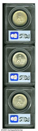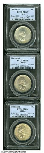 <B>1936<SET> Cincinnati PDS Set MS64 to MS65 PCGS.</B></I> The set includes: <B>1936 MS65,</B></I> original honey-gold and lilac colors, a decent strike; <B>1936-D MS65,</B></I> the obverse is dominated by medium olive-tan toning while the reverse is only faintly toned; and a <B>1936-S MS64,</B></I> peach and cream-gray toning consumes the obverse, the reverse features gentle chestnut patination. The original black holder of issue is included, it has three slots appropriately labeled P, D, and S, the left and right edges have been secured with scotch tape.
