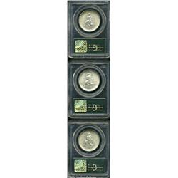 <B>1936<SET> Cincinnati PDS Set MS65 PCGS.</B></I> The set includes: <B>1936,</B></I> a reasonable strike, lightly toned and clean; <B>1936-D,</B></I> a good strike, carefully preserved, freckles of tan patina; and a <B>1936-S,</B></I> a mark on the lady's knee but an attractive dusky-gray Gem. A scarce set, since the type was struck only in 1936 and the mintage was 5,000 pieces per issue (excluding those reserved for assay). All three pieces are housed in prior generation PCGS holders that have consecutive serial numbers. 3 Coins <BR><BR><B>Important notice:</B> Heritage usually auctions material at the rate of 200-250 lots per hour. On some occasions eBay Live bid software or the Internet may not be able to keep up with the pace of the auction. We recommend placing a realistic absentee bid now as insurance to avoid disappointment. Occasionally the auctioneer may eliminate or reject an eBay Live bid, and the auctioneer may also reopen a lot after the close of the eBay live bidding (usually because we missed an audience bid), and may reject your bid even if it shows you as the winning bidder. By bidding via eBay Live, you agree that Heritage may award the lot to another bidder at its sole discretion under the circumstances described above or any other reasonable circumstances. Since eBay bids are not shown to us until we open the lot on the floor, we treat those bids just like floor bids. In most cases the floor responds before the eBay bid is presented to us, due to Internet lag time, so for consistency we have made it a policy that floor bids are always considered first over tie eBay live bids. Also please note that all Heritage lots purchased through eBay Live carry a 20% Buyer's Premium. Please make sure you read the Terms and Conditions before you bid. </span></font></tr></table></td></tr></table>