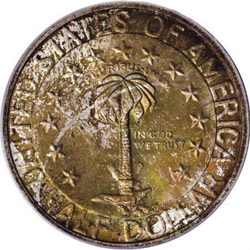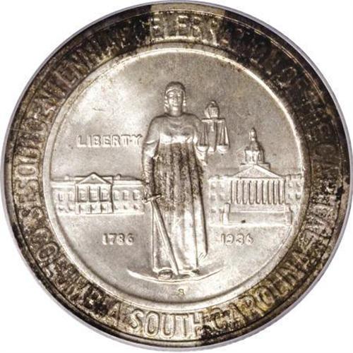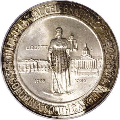 <B>1936 SET Columbia PDS Set MS64 to MS65 PCGS.</B></I> The set includes: <B>1936 MS65; 1936-D MS65;</B></I> and a <B>1936-S MS64.</B></I> All three coins are tab-toned with nearly identical mottled sea-green, peach, and ruby-red patina. The original three-slot holder that held these coins for 50 years accompanies the lot. These three coins were part of a time capsule sealed in 1936 by the Columbia Sesqui-Centennial Commission. The time capsule was opened in 1986, Columbia's bicentennial.<BR>Other documents associated with the time capsule are also included, such as copies of the minutes of a Sept. 16, 1936 meeting of the Columbia Sesqui-Centennial Commission discussing the commemorative coins; copies of a letter from James H. Hammond, Lawyer, to the "Chairman of the Bycentennial (sic) Cellebration (sic);" an empty envelope from the Columbia Sesqui-Centennial commission addressed to the Bi-Centennial Commission; copies of various correspondence concerning congressional authorization of the Columbia halves; two signed letters from John W. Flitter of the Columbia Bicentennial Committee concerning a time capsule lot of Columbia halves and a 1936 Sesquicentennial wooden nickel issue; and (6) Columbia, S.C. Sesqui-Centennial Celebration wooden nickels, two examples each of the 1, 2, and 5 denominations.<BR><I>From The Frank DuVall Collection of U.S. Commemoratives.</B></I><BR><BR><b>Shipping:</b> Coins & Currency (<a target="_blank" href="http://www.heritageauctions.com/common/shipping.php">view shipping information</a>)