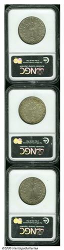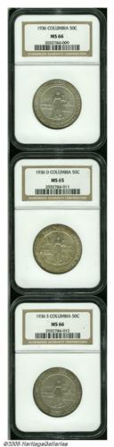 <B>1936<SET> Columbia PDS Set MS65 to MS66 NGC.</B></I> The set includes: <B>1936 MS66,</B></I> a satiny cream-gray and tan example; <B>1936-D MS65,</B></I> golden-brown and gunmetal-gray in color with a few deeper toning flecks; and a <B>1936-S MS66,</B></I> lovely blended chestnut and dove-gray patination.<BR><I>From the Dr. Kurt Peters Collection.</B></I> From the Dr. Kurt Peters Collection.