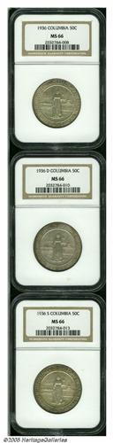 <B>1936<SET> Columbia PDS Set MS66 NGC.</B></I> The set includes: <B>1936,</B></I> light powder-blue and chestnut hues, carefully preserved; <B>1936-D,</B></I> milky tan and olive patina, a tiny green speck on the E in STATES; and a <B>1936-S,</B></I> original aquamarine, honey, and lime toning, a tick on the second T in STATES.<BR><I>From the Dr. Kurt Peters Collection.</B></I> From the Dr. Kurt Peters Collection.