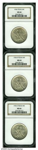 <B>1936<SET> Texas PDS Set MS66 NGC.</B></I> The set includes: <B>1936,</B></I> lustrous, nearly pristine, well struck, lilac and chestnut toning; <B>1936-D,</B></I> a good strike, undisturbed, lovely dove-gray color; and a <B>1936-S,</B></I> creamy luster, a decent strike, glimpses of lavender and honey patina.<BR><I>From the Dr. Kurt Peters Collection.</B></I> From the Dr. Kurt Peters Collection.