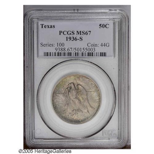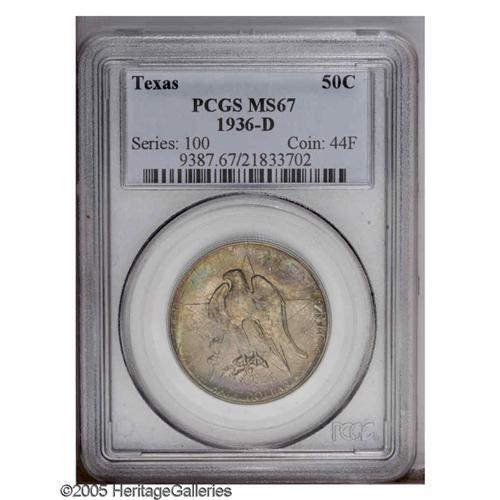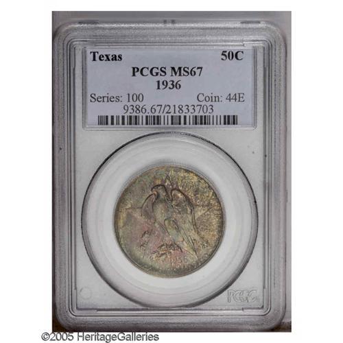 <B>1936<SET> Texas PDS Set MS67 PCGS.</B></I> The set includes: <B>1936,</B></I> sharply struck and unblemished, with crimson and gold-green toning; <B>1936-D,</B></I> a melange of golden-gray, lime-green, and magenta toning adheres to lustrous surfaces; and a <B>1936-S,</B></I> a mix of magenta, golden-gray, and ice-blue patina bathes lustrous surfaces.