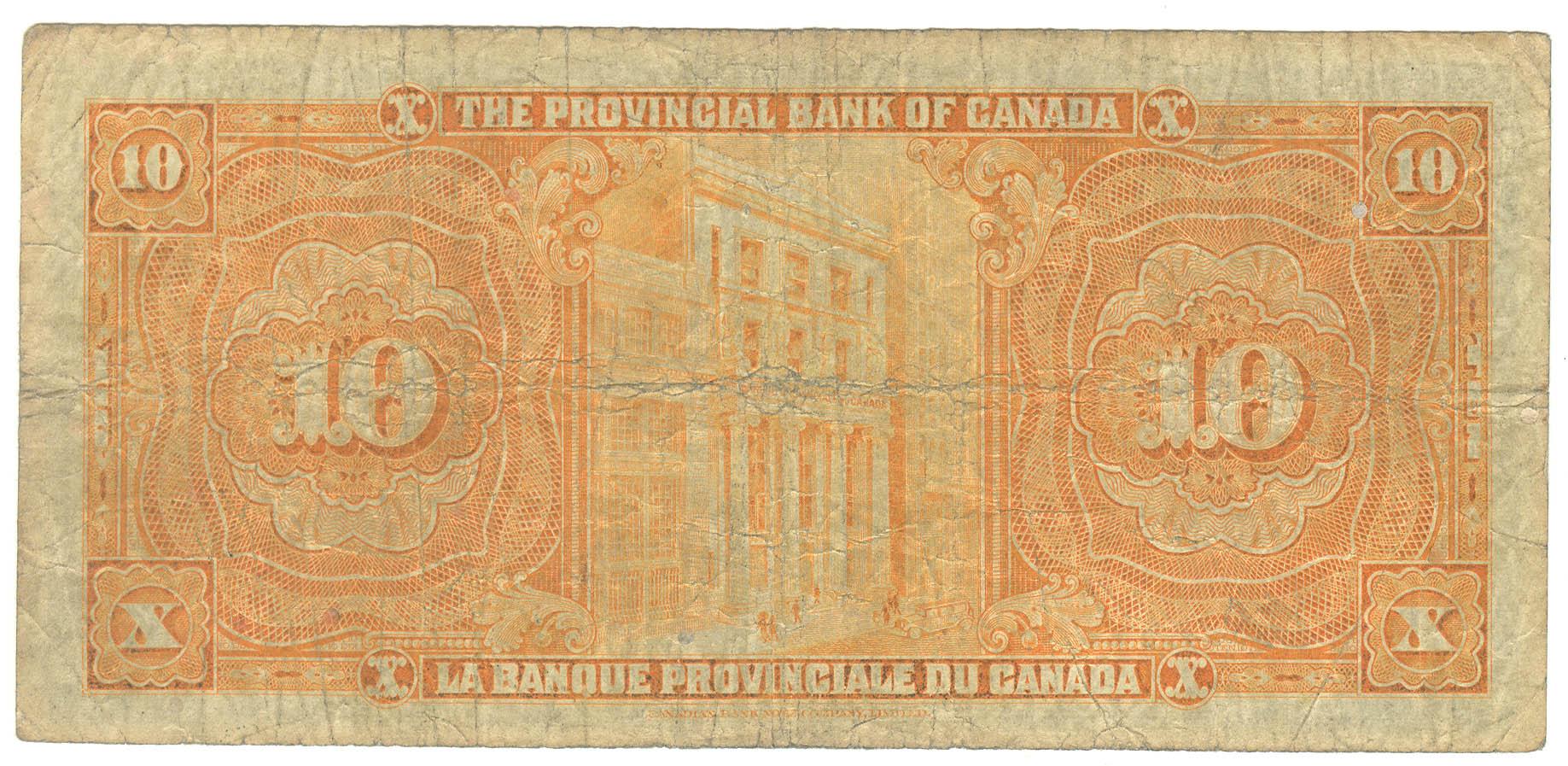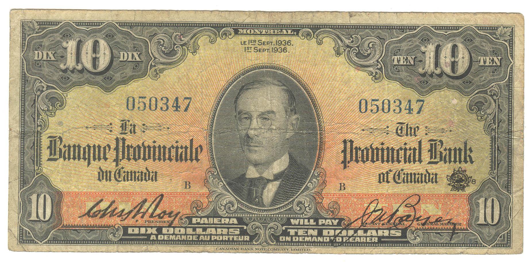 1936 Ten Dollars The Provincial Bank of Canada, VG/F, 615-18-06, Roy Boyer, serial 050347, Letter B, Orange Back.