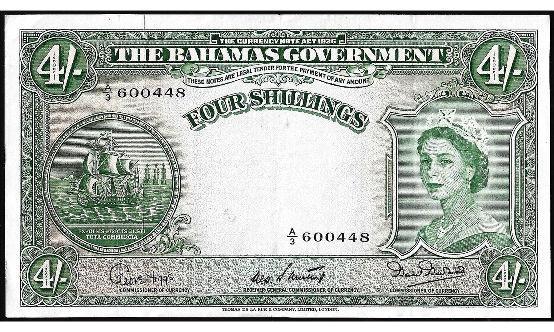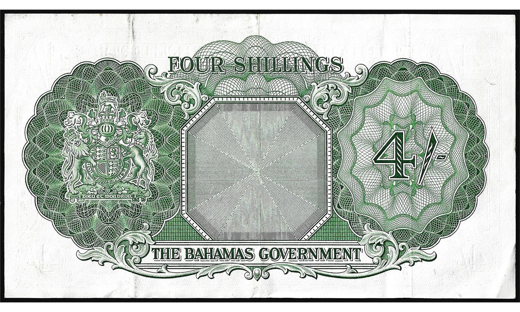 One 1936 The Bahamas Government Four Shillings Currency Note.