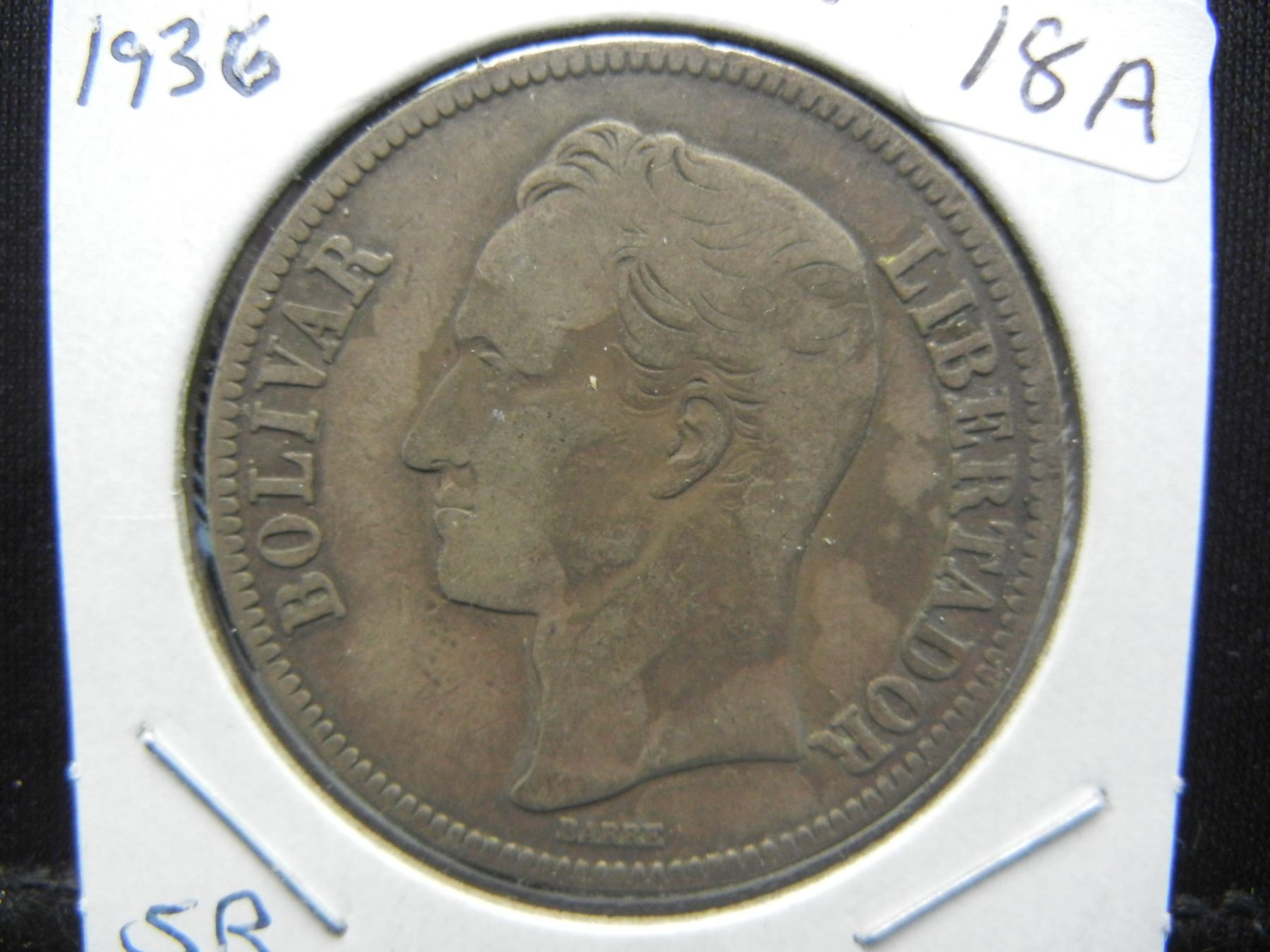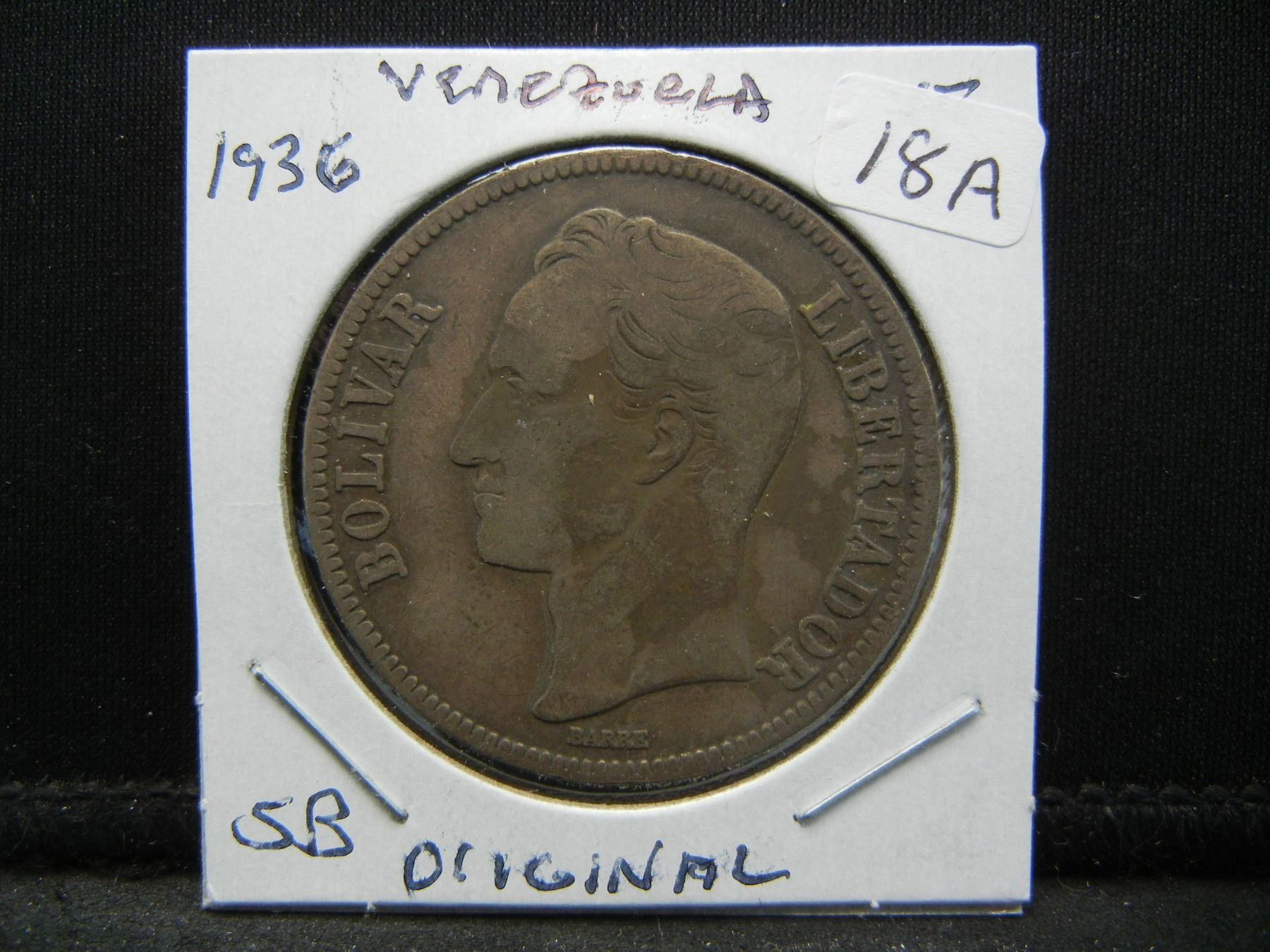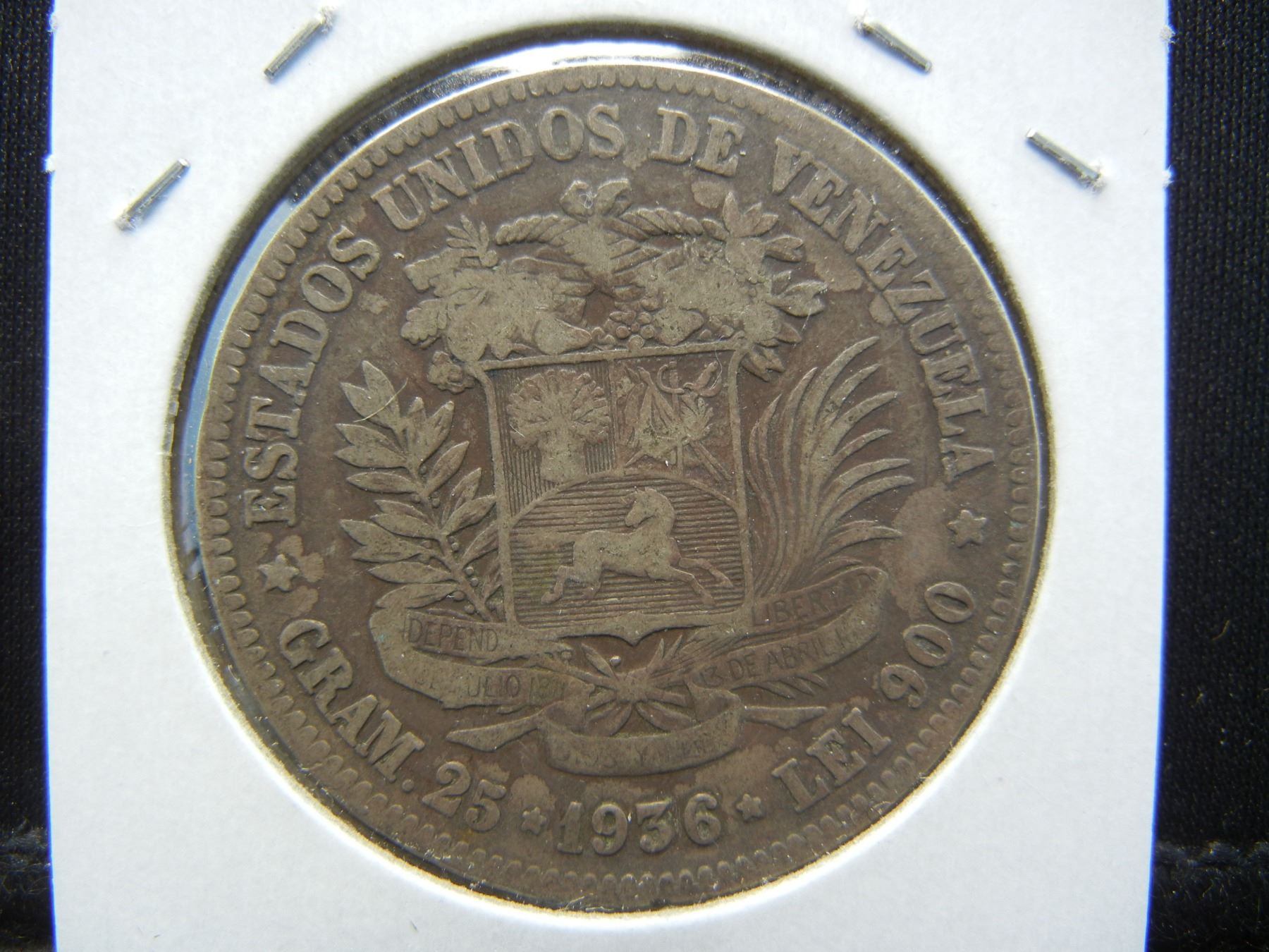 1936 Venezuela 5 Bolivares 90% silver coin.  Extremely Fine.