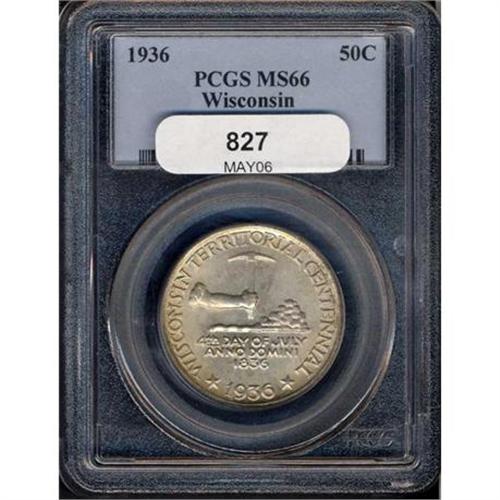 <b>1936 Wisconsin Half Dollar. PCGS graded MS66.</b> Fully original, the surfaces display few noticeable abrasions plus are at the high end of the scale when it comes to agreeable light toning. Struck with almost scientific precision on the key design features. The Wisconsin state animal, the badger, appears on the reverse. The Wisconsin State Song, "On Wisconsin!" whose rhythmic and rousing beats of "On Wisconsin," became a popular football ditty in 1909, began filling the air as the official state song in 1959 <b>(PCGS # 9447)</b> <i>