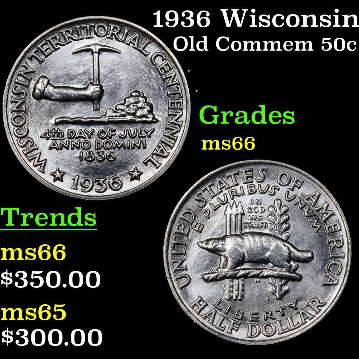 1936 Wisconsin Old Commem Half Dollar 50c Grades GEM+ Unc.