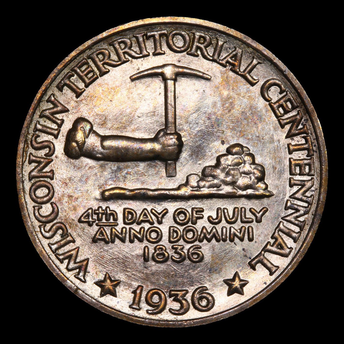 1936 Wisconsin Old Commem Half Dollar 50c Grades GEM++ Unc. Continuing the outpouring of commemorative coins issued during the year was the 1936 Wisconsin Territorial Centennial Half Dollar. As the name suggests, this issue does not mark the 100th anniversary of statehood, which would occur six years later, but rather the start of the territorial government.