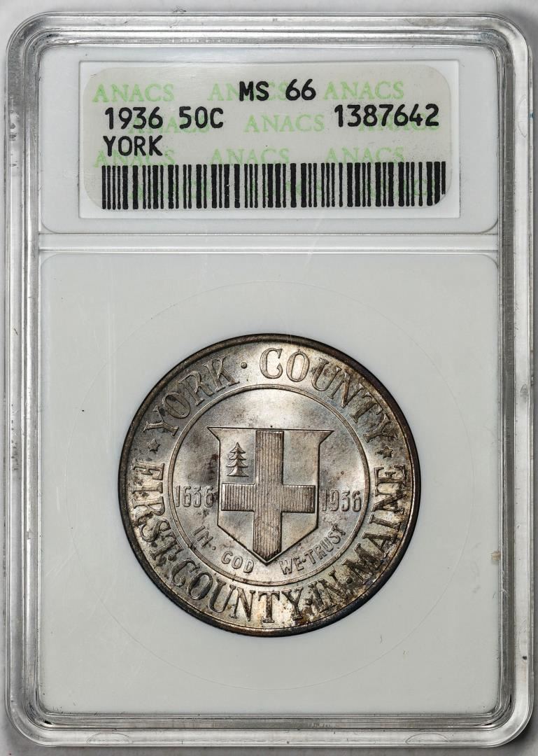 One 1936 York County Commemorative Half Dollar Coin ANACS MS66 Old Soap Box Holder. ANACS Certified.
