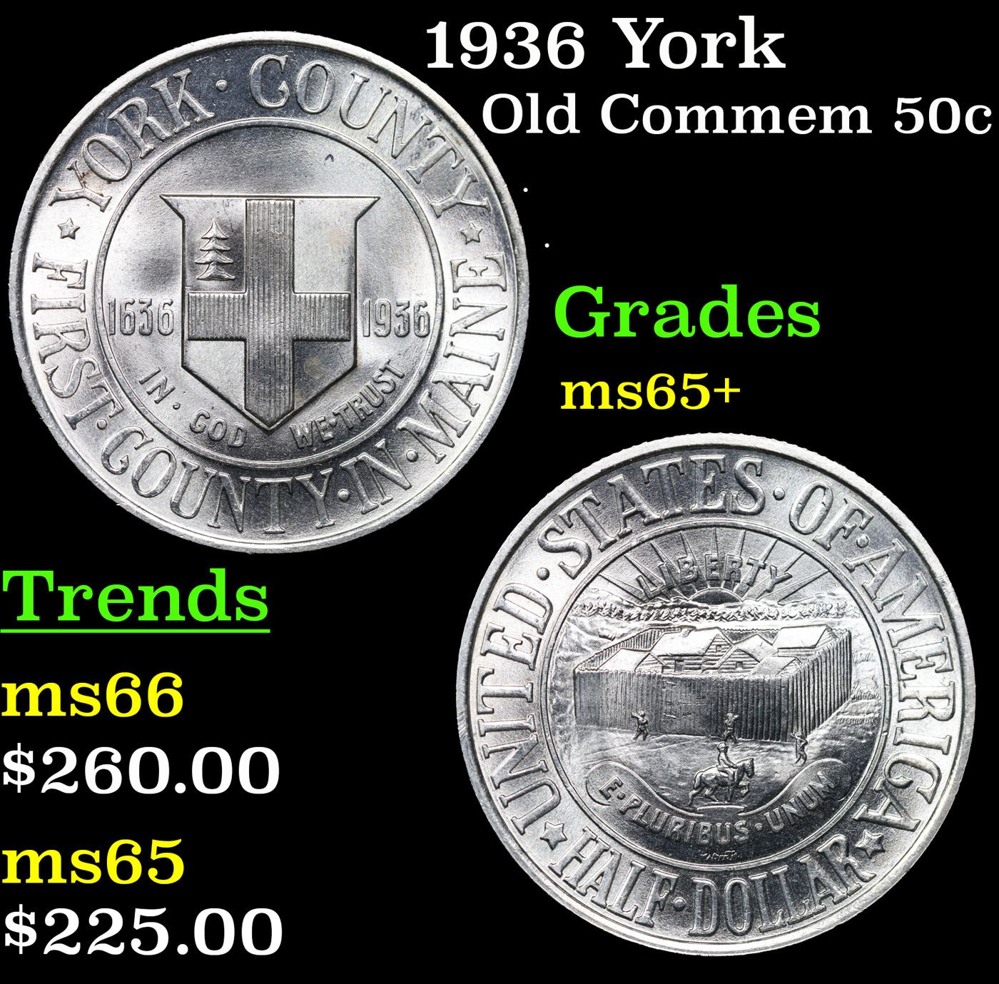 1936 York Old Commem Half Dollar 50c Grades GEM+ Unc. The founding of the first county of Maine was commemorated by the 1936 York County Tercentenary Half Dollar. This issue was released amidst the outpouring of other commemoratives issued during the year, for occasions both significant and relatively obscure.Designs for the coin were created by Walter H. Rich, a wildlife painter from Portland. The obverse features an image of Brown’s Garrison, the original settlement of York County. The image is based on a woodcut printed in The Proprietors of Saco. The reverse of the coin features the York County Seal, which consists of a shield containing a cross and pine tree. IThe maximum authorized mintage for the York Half Dollars was 30,000 pieces. An initial quantity of 25,015 was struck at the Philadelphia Mint and offered for sale by the York County Tercentenary Coin Commission for $1.50 to state residents and $1.65 to those out of state.