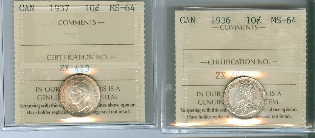 1936 and 1937 Lot of 2 ICCS graded 10¢ coins, both MS64 and