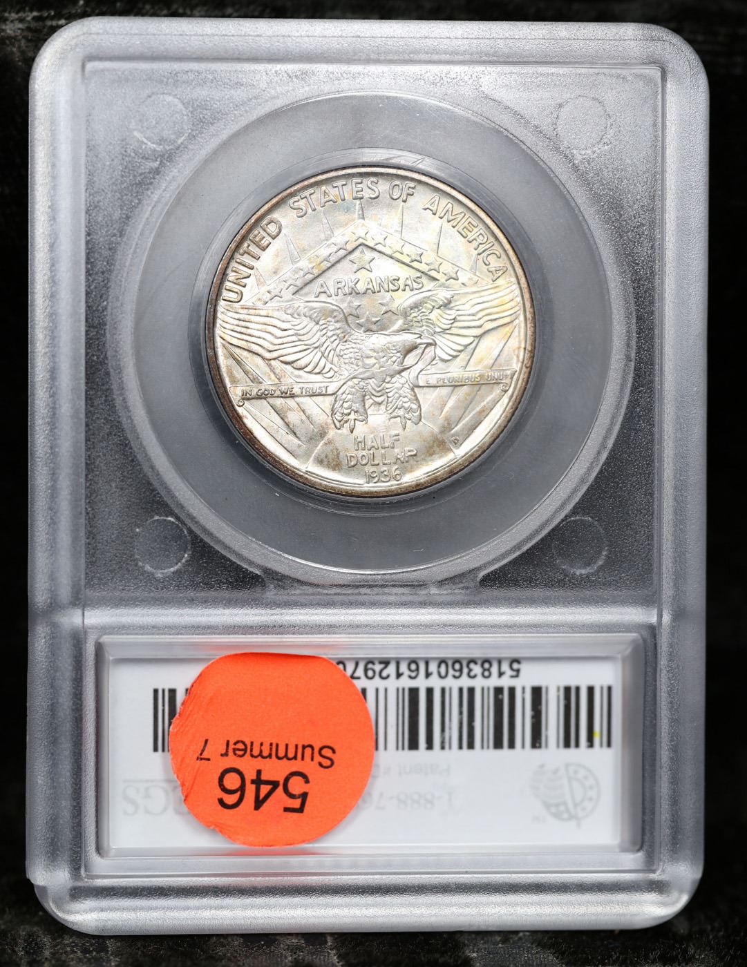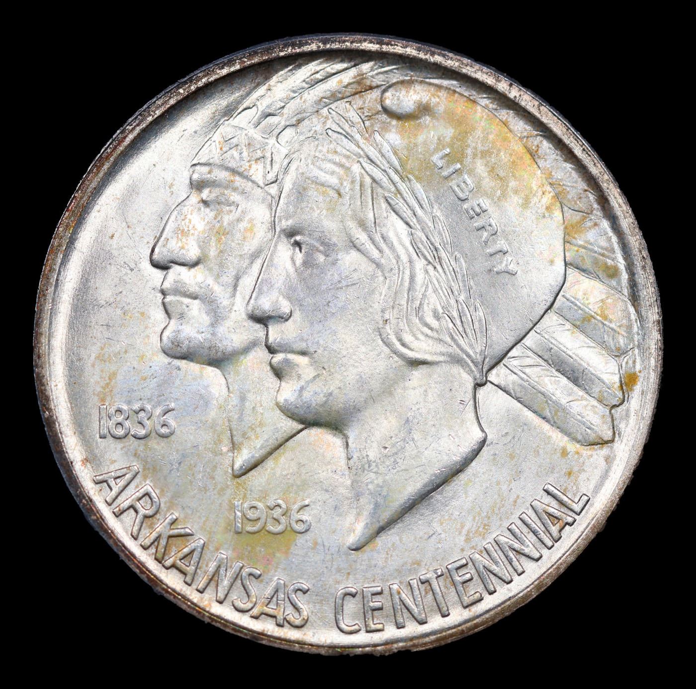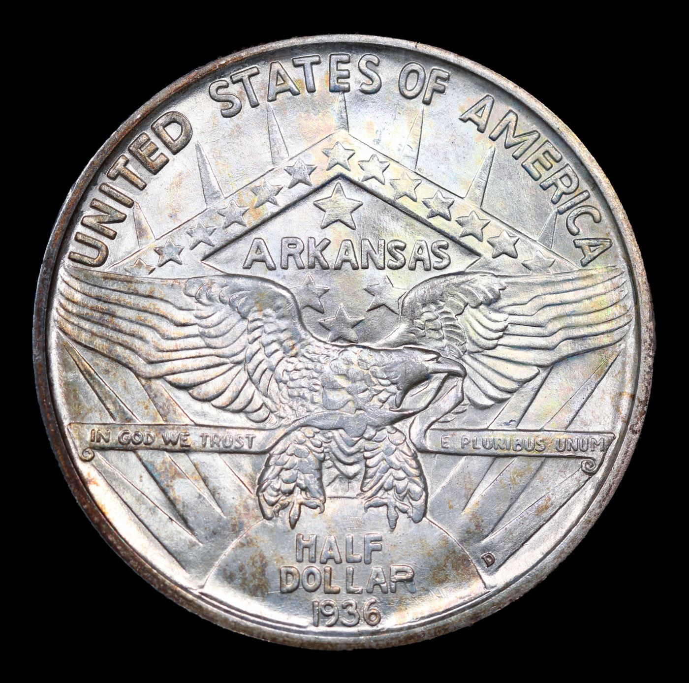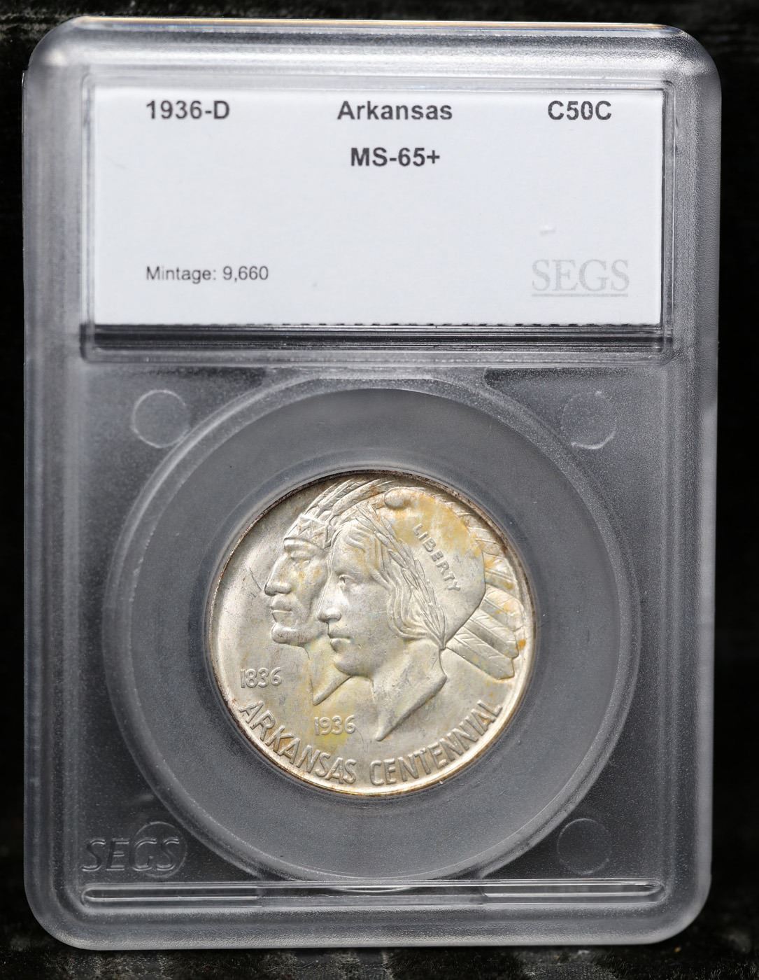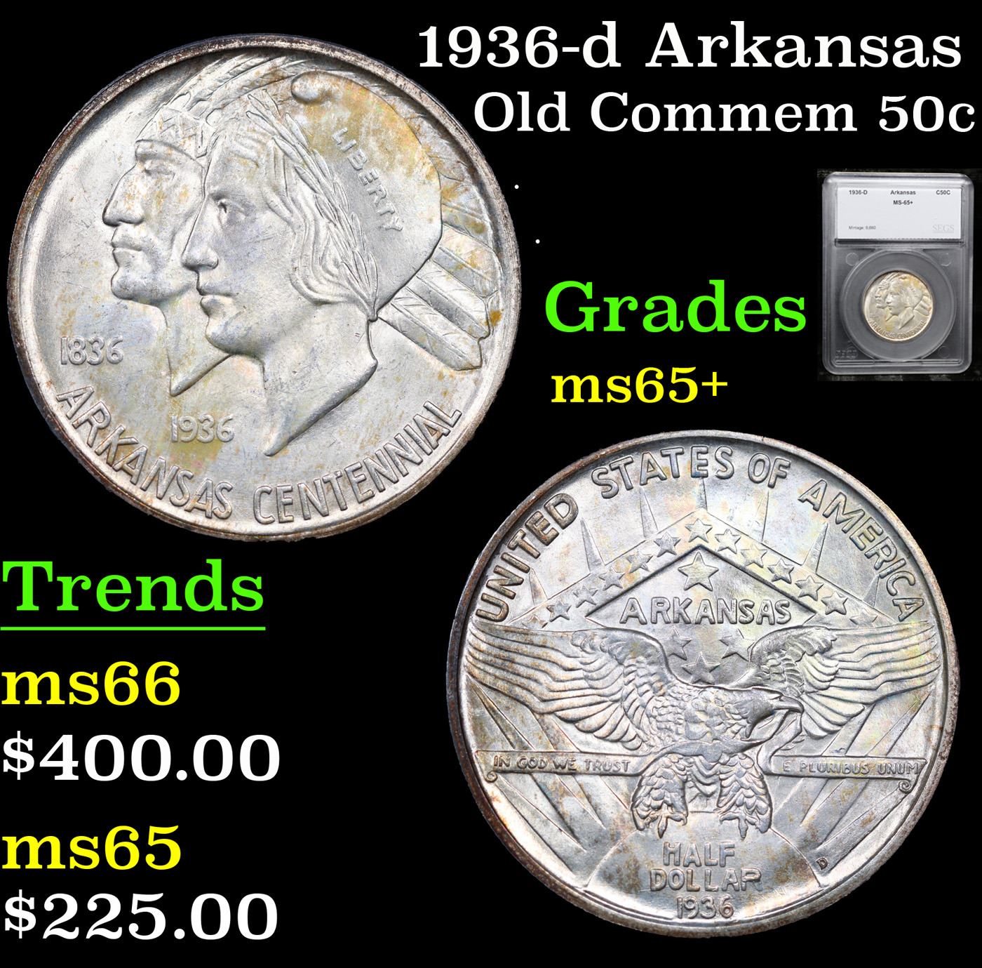 1936-d Arkansas Old Commem Half Dollar 50c Graded ms65+ BY SEGS. Commemorative coins were authorized to celebrate the 100th anniversary of the admission of Arkansas into the Union. The Arkansas Centennial Half Dollars ended up being issued during five separate years, across three different mints. The coins became controversial due to the stream of variations created specifically to market to collectors, as well as the escalating issue prices as mintage for later issues became smaller.The obverse design features the head of Liberty and a Native American in headdress. Although this is now considered to be the obverse of the coin, there was initially some confusion and US Mint records and some references refer to this side as the reverse. In 1936, a new design was issued for this side of the coin, featuring a Senator who was living at the time of issue. The 1936 Robinson-Arkansas Half Dollar is considered a separate issue by most collectors.The reverse of the coin features the image of an eagle with wings spread, perched on the rising sun with rays emanating upwards. In the background a geometrical shape appears with the word “Arkansas” at center, amidst an arrangement of stars. Both the obverse and reverse design designed by Edward Everett Burr, following models prepared by Emily Bates.At the onset, the Arkansas Half Dollar was struck in a modest quantity of 13,012 pieces at the Philadelphia Mint with an additional 5,505 from Denver and 5,506 from San Francisco. The Philadelphia issues were sold at an issue price of $1 each, while the mint marked coins were purchased in a bulk transaction by a coin dealer and subsequently sold for $2.75 each. This initial situation was a taste of things to come.In the following year, coins from three different mints were initially offered for $1 each, but the price was quickly raised to $1.50 per coin, and eventually sold as sets of three coins for $6.75. The following year three coin sets were sold at $8.75, which was eventually raised to $10. This would also be the price of the 1939 sets.