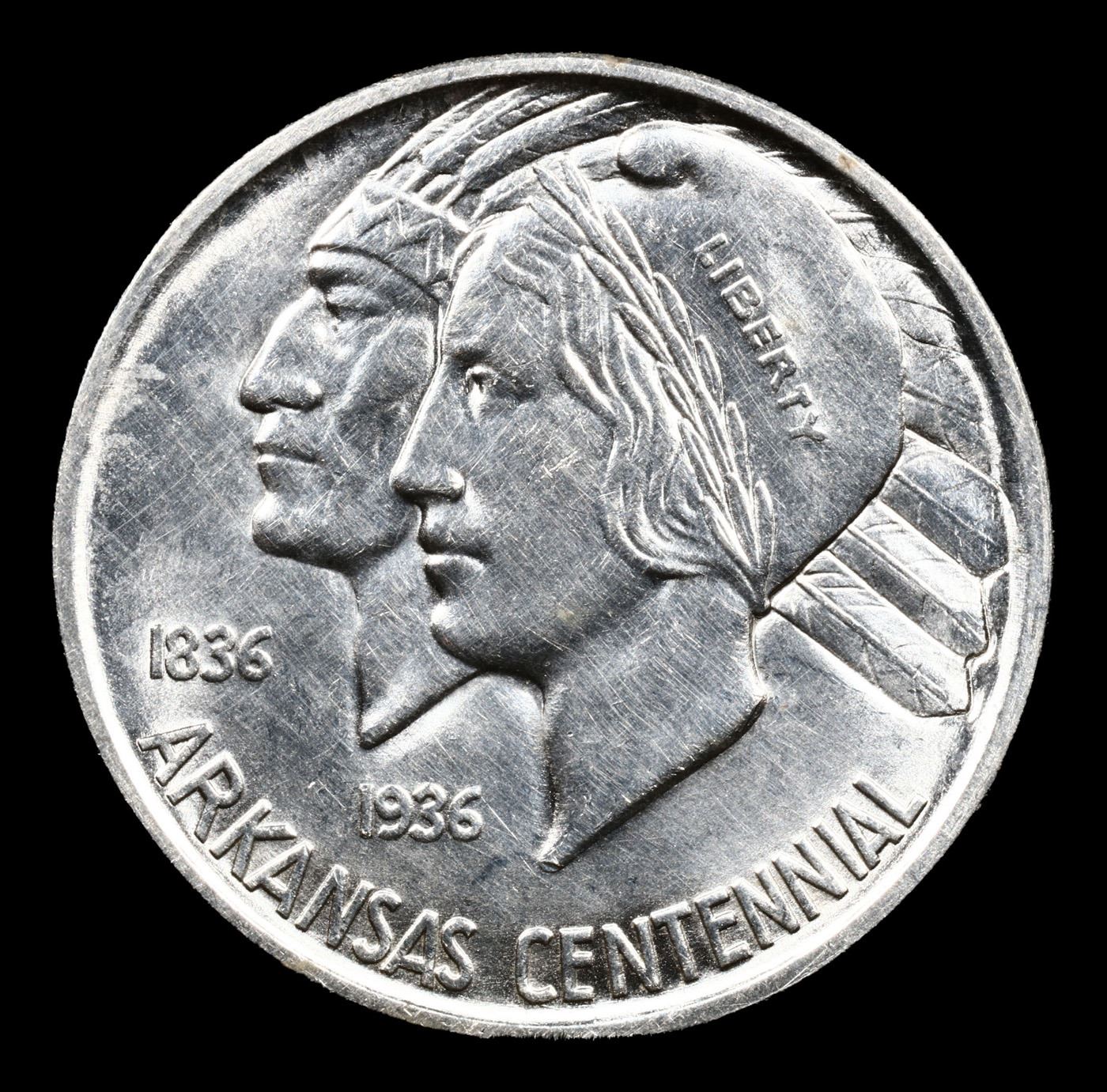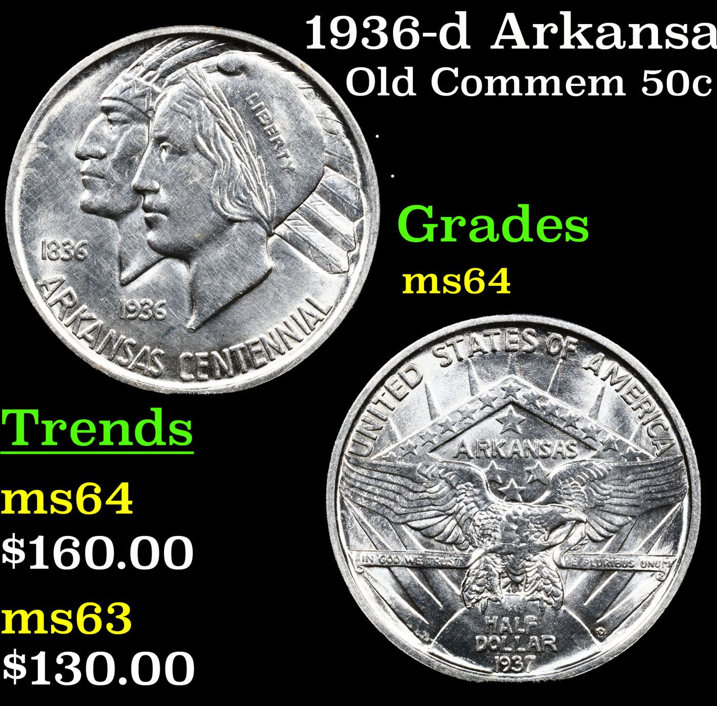 1936-d Arkansas Old Commem Half Dollar 50c Grades Choice Unc. Commemorative coins were authorized to celebrate the 100th anniversary of the admission of Arkansas into the Union. The Arkansas Centennial Half Dollars ended up being issued during five separate years, across three different mints. The coins became controversial due to the stream of variations created specifically to market to collectors, as well as the escalating issue prices as mintage for later issues became smaller.The obverse design features the head of Liberty and a Native American in headdress. Although this is now considered to be the obverse of the coin, there was initially some confusion and US Mint records and some references refer to this side as the reverse. In 1936, a new design was issued for this side of the coin, featuring a Senator who was living at the time of issue. The 1936 Robinson-Arkansas Half Dollar is considered a separate issue by most collectors.The reverse of the coin features the image of an eagle with wings spread, perched on the rising sun with rays emanating upwards. In the background a geometrical shape appears with the word “Arkansas” at center, amidst an arrangement of stars. Both the obverse and reverse design designed by Edward Everett Burr, following models prepared by Emily Bates.At the onset, the Arkansas Half Dollar was struck in a modest quantity of 13,012 pieces at the Philadelphia Mint with an additional 5,505 from Denver and 5,506 from San Francisco. The Philadelphia issues were sold at an issue price of $1 each, while the mint marked coins were purchased in a bulk transaction by a coin dealer and subsequently sold for $2.75 each. This initial situation was a taste of things to come.In the following year, coins from three different mints were initially offered for $1 each, but the price was quickly raised to $1.50 per coin, and eventually sold as sets of three coins for $6.75. The following year three coin sets were sold at $8.75, which was eventually raised to $10. This would also be the price of the 1939 sets.