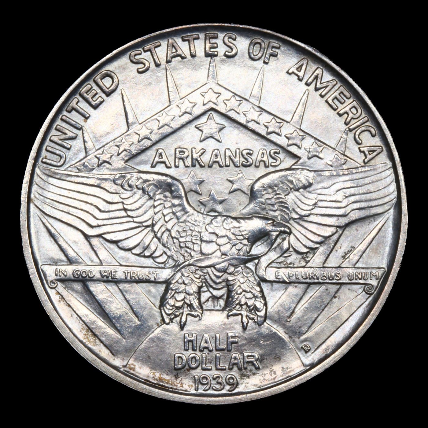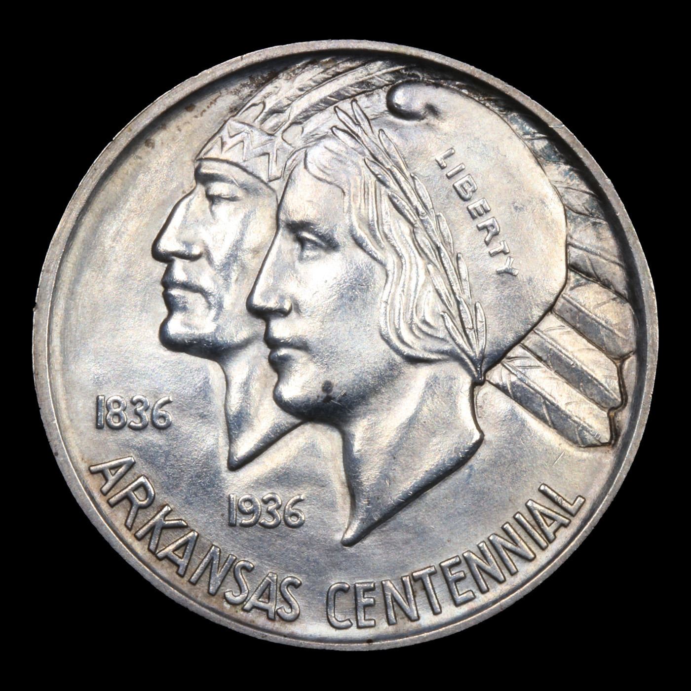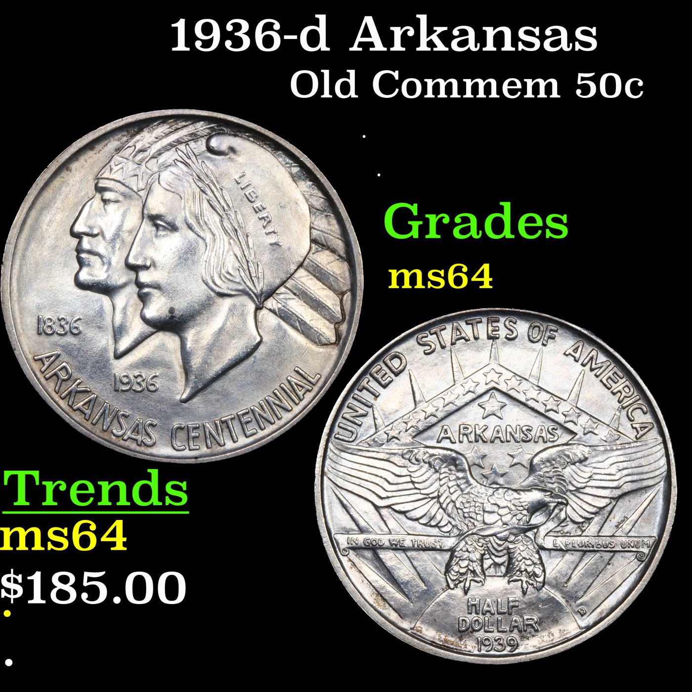 1936-d Arkansas Old Commem Half Dollar 50c Grades Choice Unc. Commemorative coins were authorized to celebrate the 100th anniversary of the admission of Arkansas into the Union. The Arkansas Centennial Half Dollars ended up being issued during five separate years, across three different mints. The coins became controversial due to the stream of variations created specifically to market to collectors, as well as the escalating issue prices as mintage for later issues became smaller.The obverse design features the head of Liberty and a Native American in headdress. Although this is now considered to be the obverse of the coin, there was initially some confusion and US Mint records and some references refer to this side as the reverse. In 1936, a new design was issued for this side of the coin, featuring a Senator who was living at the time of issue. The 1936 Robinson-Arkansas Half Dollar is considered a separate issue by most collectors.The reverse of the coin features the image of an eagle with wings spread, perched on the rising sun with rays emanating upwards. In the background a geometrical shape appears with the word “Arkansas” at center, amidst an arrangement of stars. Both the obverse and reverse design designed by Edward Everett Burr, following models prepared by Emily Bates.At the onset, the Arkansas Half Dollar was struck in a modest quantity of 13,012 pieces at the Philadelphia Mint with an additional 5,505 from Denver and 5,506 from San Francisco. The Philadelphia issues were sold at an issue price of $1 each, while the mint marked coins were purchased in a bulk transaction by a coin dealer and subsequently sold for $2.75 each. This initial situation was a taste of things to come.In the following year, coins from three different mints were initially offered for $1 each, but the price was quickly raised to $1.50 per coin, and eventually sold as sets of three coins for $6.75. The following year three coin sets were sold at $8.75, which was eventually raised to $10. This would also be the price of the 1939 sets.