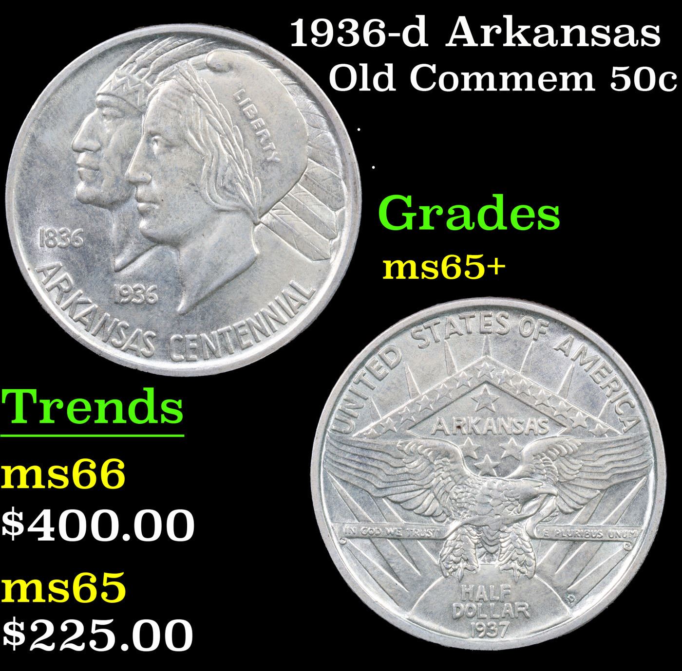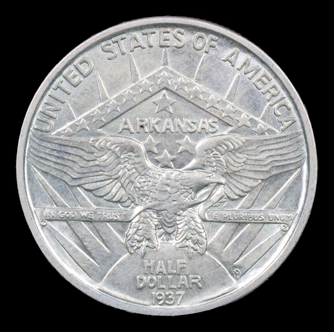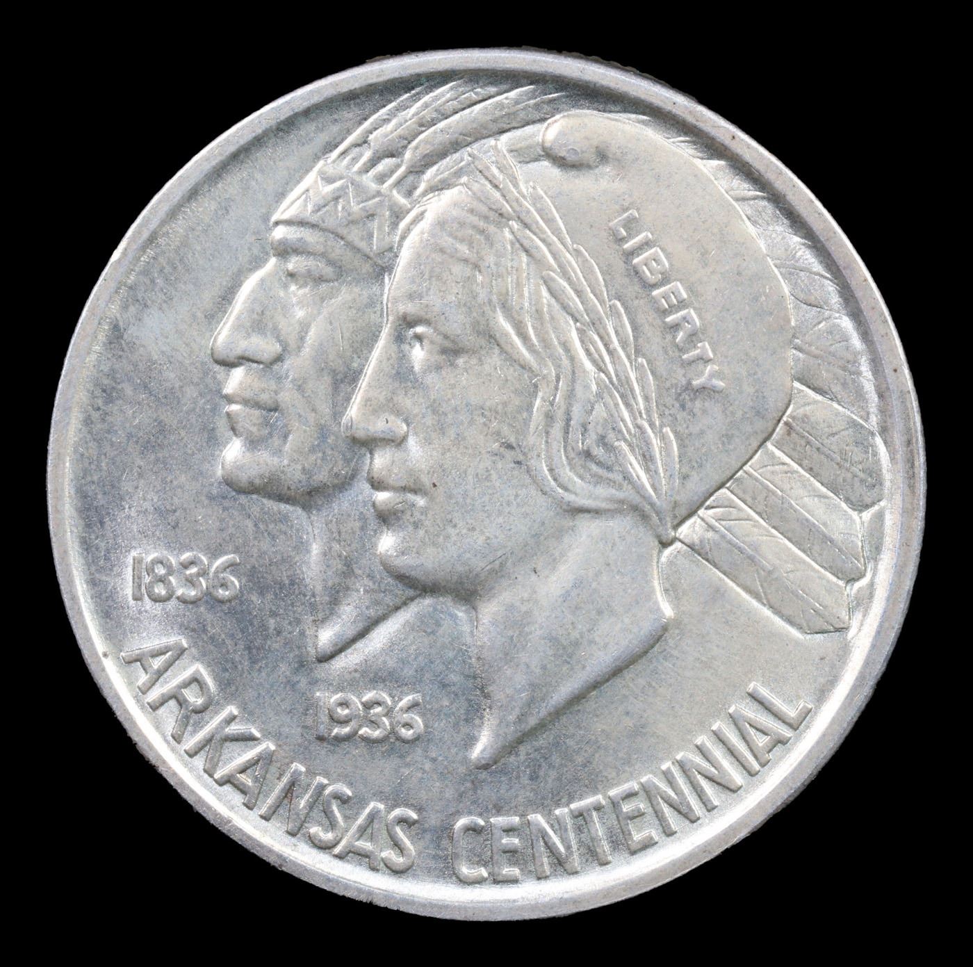 1936-d Arkansas Old Commem Half Dollar 50c Grades GEM+ Unc. Commemorative coins were authorized to celebrate the 100th anniversary of the admission of Arkansas into the Union. The Arkansas Centennial Half Dollars ended up being issued during five separate years, across three different mints. The coins became controversial due to the stream of variations created specifically to market to collectors, as well as the escalating issue prices as mintage for later issues became smaller.The obverse design features the head of Liberty and a Native American in headdress. Although this is now considered to be the obverse of the coin, there was initially some confusion and US Mint records and some references refer to this side as the reverse. In 1936, a new design was issued for this side of the coin, featuring a Senator who was living at the time of issue. The 1936 Robinson-Arkansas Half Dollar is considered a separate issue by most collectors.The reverse of the coin features the image of an eagle with wings spread, perched on the rising sun with rays emanating upwards. In the background a geometrical shape appears with the word “Arkansas” at center, amidst an arrangement of stars. Both the obverse and reverse design designed by Edward Everett Burr, following models prepared by Emily Bates.At the onset, the Arkansas Half Dollar was struck in a modest quantity of 13,012 pieces at the Philadelphia Mint with an additional 5,505 from Denver and 5,506 from San Francisco. The Philadelphia issues were sold at an issue price of $1 each, while the mint marked coins were purchased in a bulk transaction by a coin dealer and subsequently sold for $2.75 each. This initial situation was a taste of things to come.In the following year, coins from three different mints were initially offered for $1 each, but the price was quickly raised to $1.50 per coin, and eventually sold as sets of three coins for $6.75. The following year three coin sets were sold at $8.75, which was eventually raised to $10. This would also be the price of the 1939 sets.