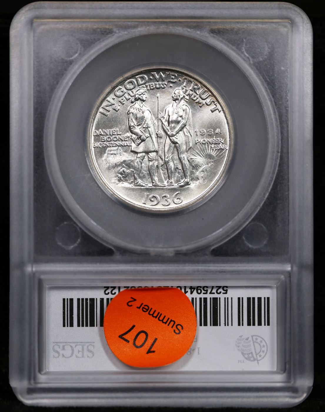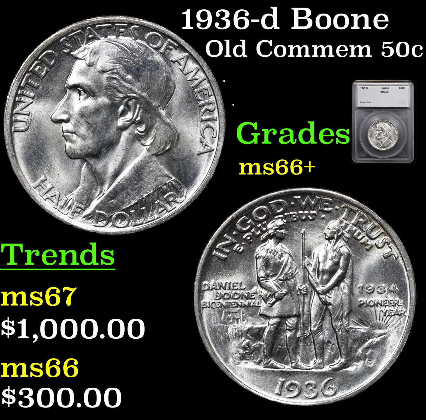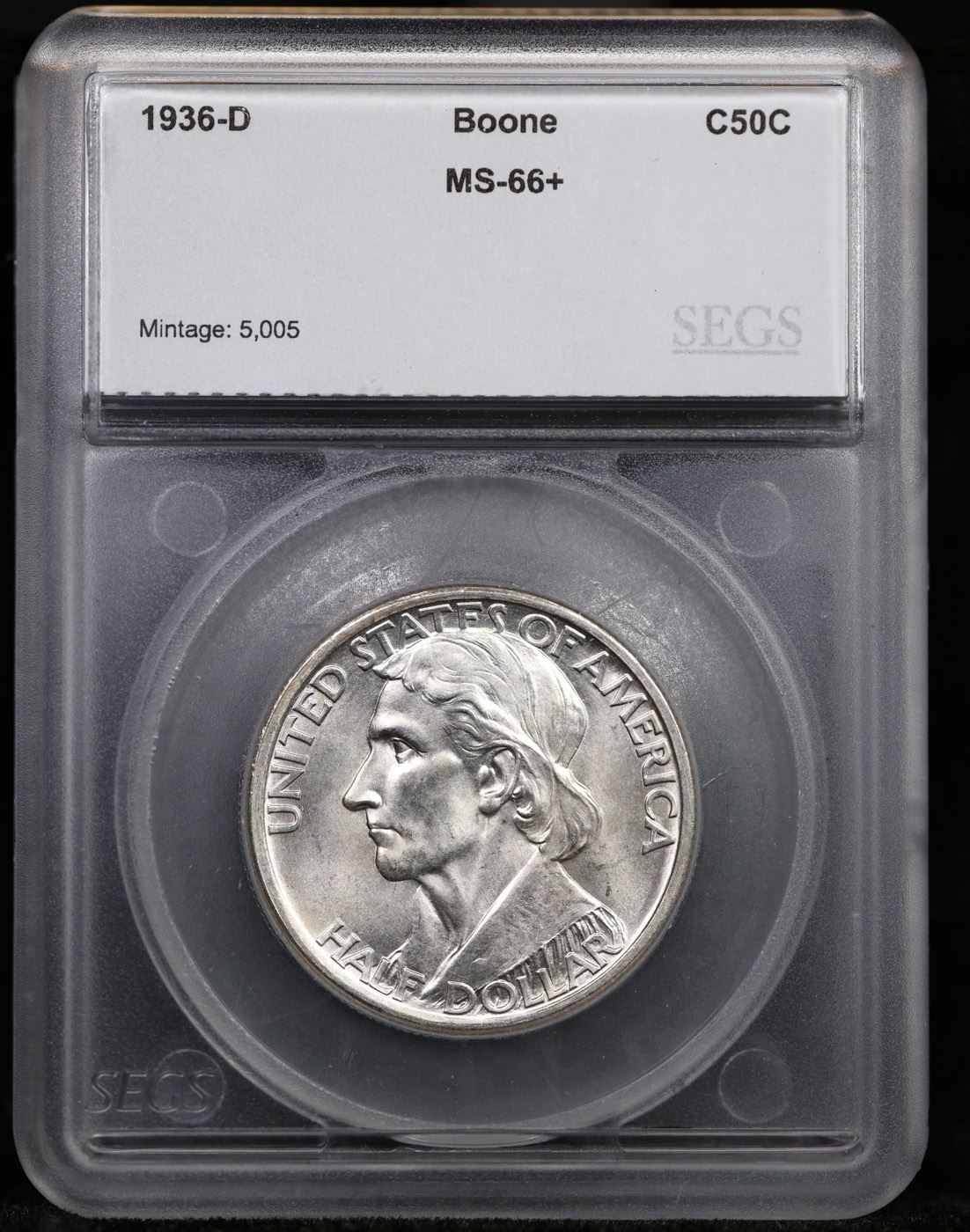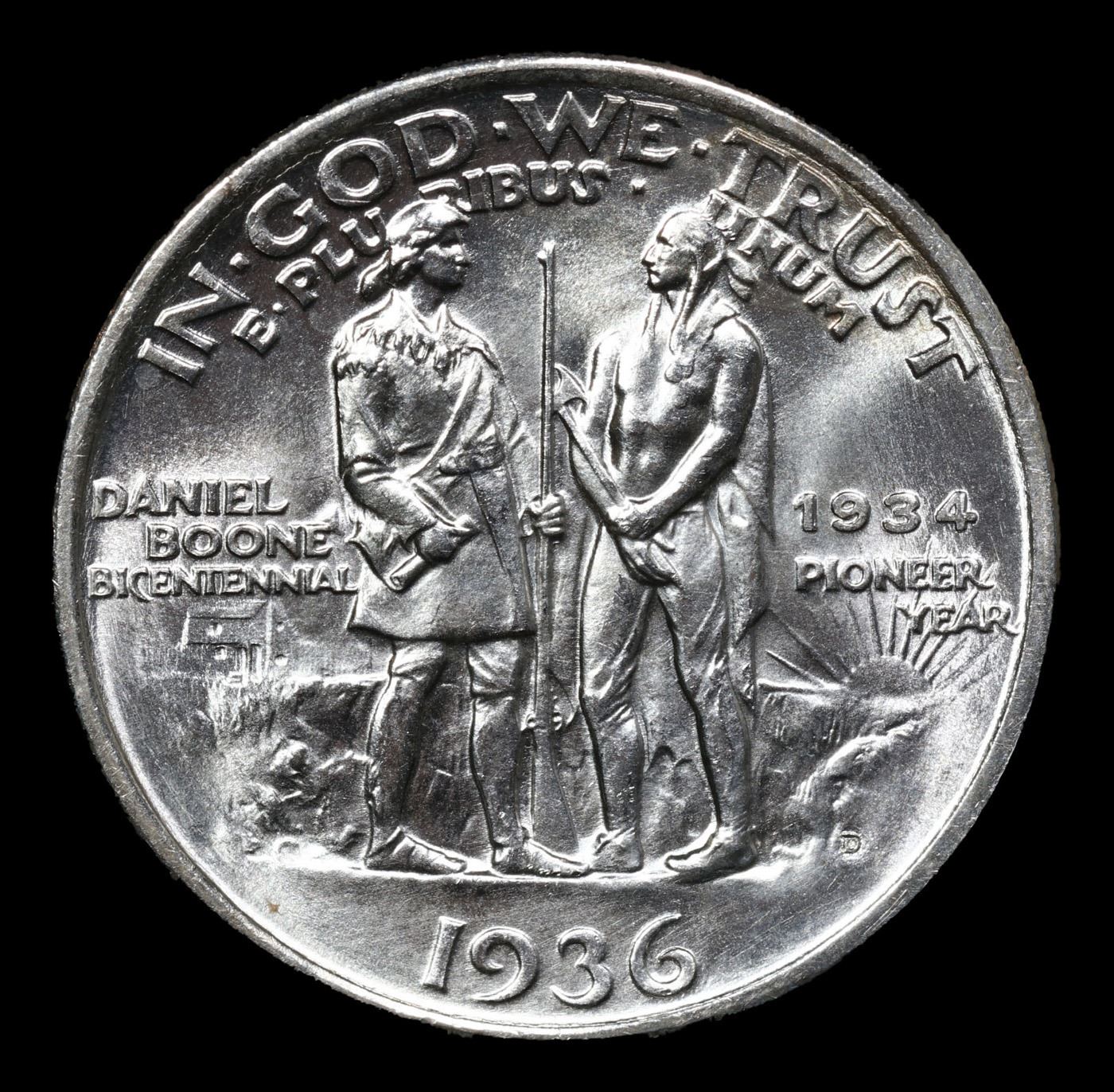 1936-d Boone Old Commem Half Dollar 50c Graded ms66+ By SEGS. The Daniel Boone Half Dollar was minted to celebrate the 200th anniversary of the birth of the famous frontiersman, explorer, and folk hero. Originally, the coins were struck at the Philadelphia Mint to coincide with the bicentennial year. During the next four years, the coins would continue to be struck, across three different mint facilities.On the obverse of the coin is a portrait of Daniel Boone. Since no known portraits of him exist, this is an artists conception created by Augustus Lukeman. The likeness looks decidedly different than the portrait of Boone, which had appeared on the previous 1921 Missouri Centennial Half Dollar. The reverse of the coin features a scene of the frontiersman holding a chart of Kentucky and a musket, facing an American Indian holding a tomahawk. In the background a blockhouse stockade and a sun with rays appear. This was also designed by Augustus Lukeman. Out of the maximum authorized mintage of 600,000 coins, there were only 10,007 of the 1934 Daniel Boone Half Dollars produced and sold at a price of $1.60 each. In the following year, additional coins were struck at the Philadelphia, Denver, and San Francisco Mints carrying the 1935 date. Subsequent to the initial distribution, legislation was passed in Congress stipulating that the original design should be supplemented by adding the bicentennial year “1934” to the reverse of the coin. A smaller number of coins were minted with the “small 1934 on reverse” and came to represent a scarce variety.More coins continued to be minted and issued in 1936, 1937, and 1938. The final two years would have smaller net distribution levels as collectors began to grow weary of the endless string of varieties of the commemorative coin, issued years after the actual bicentennial.