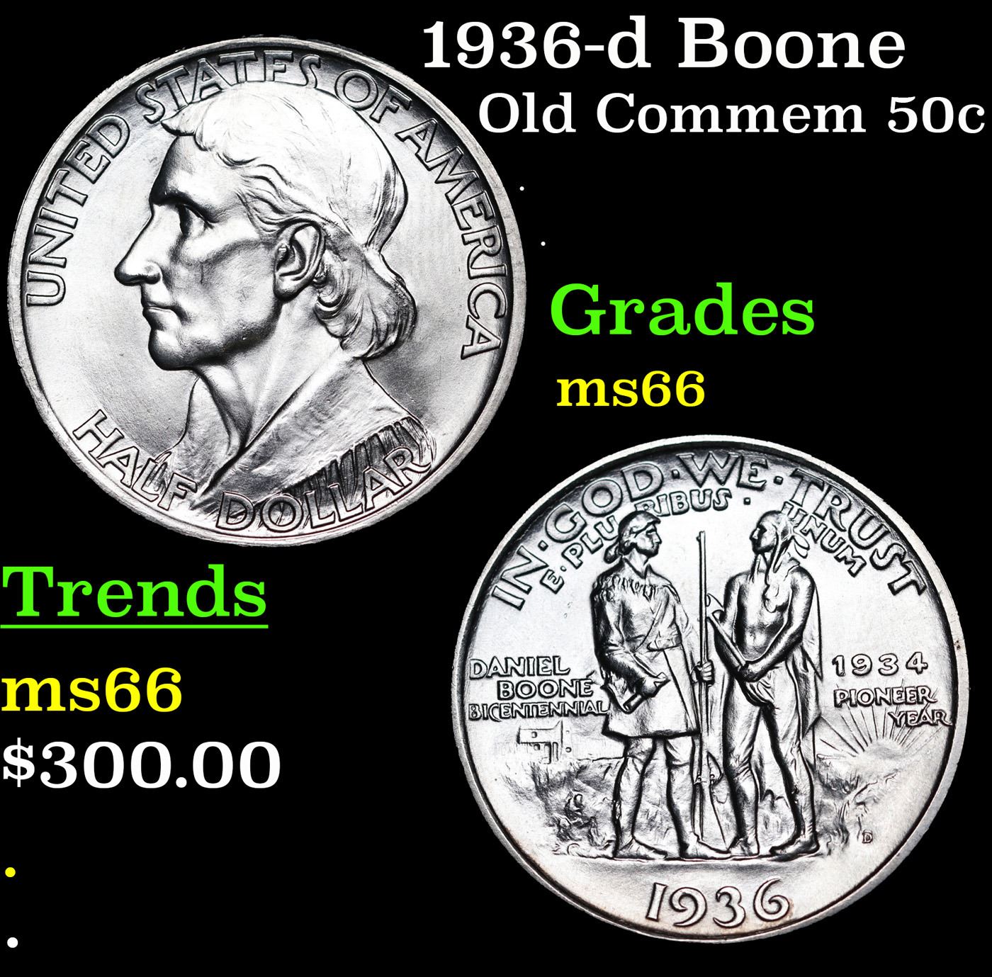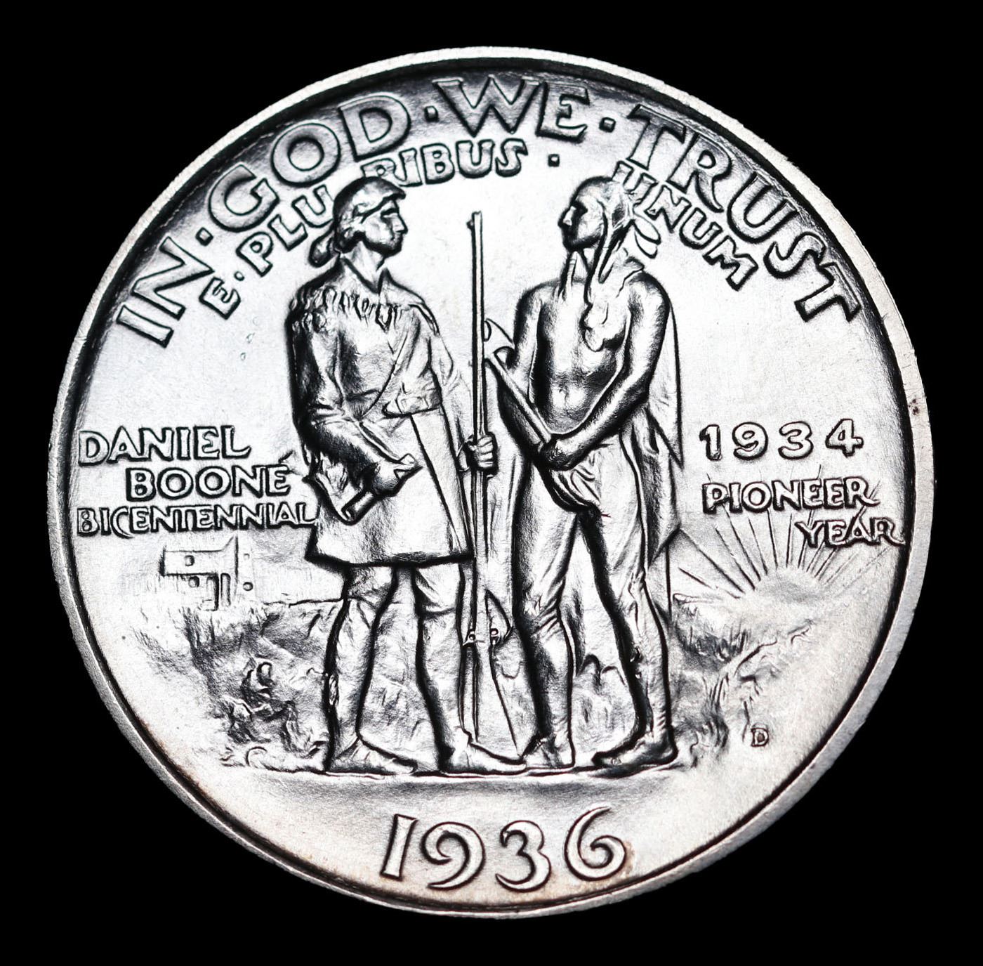 1936-d Boone Old Commem Half Dollar 50c Grades GEM+ Unc. The Daniel Boone Half Dollar was minted to celebrate the 200th anniversary of the birth of the famous frontiersman, explorer, and folk hero. Originally, the coins were struck at the Philadelphia Mint to coincide with the bicentennial year. During the next four years, the coins would continue to be struck, across three different mint facilities.On the obverse of the coin is a portrait of Daniel Boone. Since no known portraits of him exist, this is an artists conception created by Augustus Lukeman. The likeness looks decidedly different than the portrait of Boone, which had appeared on the previous 1921 Missouri Centennial Half Dollar. The reverse of the coin features a scene of the frontiersman holding a chart of Kentucky and a musket, facing an American Indian holding a tomahawk. In the background a blockhouse stockade and a sun with rays appear. This was also designed by Augustus Lukeman. Out of the maximum authorized mintage of 600,000 coins, there were only 10,007 of the 1934 Daniel Boone Half Dollars produced and sold at a price of $1.60 each. In the following year, additional coins were struck at the Philadelphia, Denver, and San Francisco Mints carrying the 1935 date. Subsequent to the initial distribution, legislation was passed in Congress stipulating that the original design should be supplemented by adding the bicentennial year “1934” to the reverse of the coin. A smaller number of coins were minted with the “small 1934 on reverse” and came to represent a scarce variety.More coins continued to be minted and issued in 1936, 1937, and 1938. The final two years would have smaller net distribution levels as collectors began to grow weary of the endless string of varieties of the commemorative coin, issued years after the actual bicentennial.