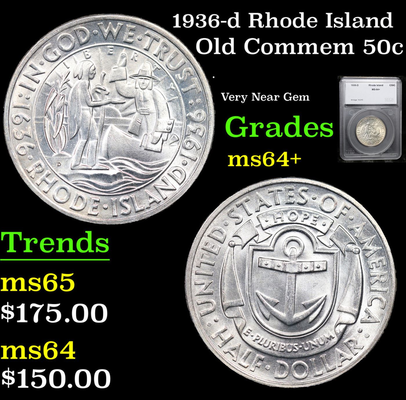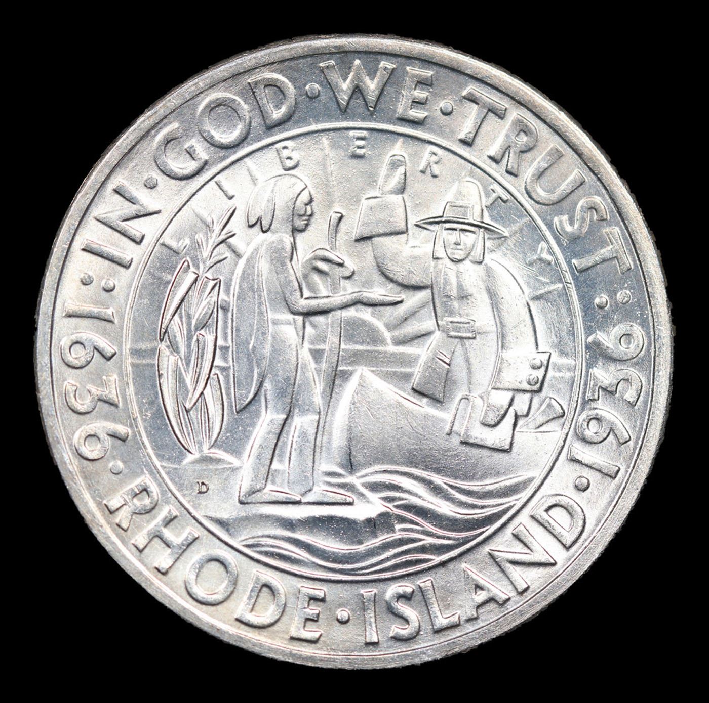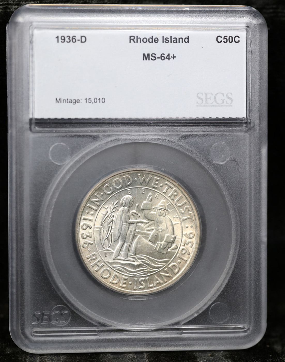 1936-d Rhode Island Old Commem Half Dollar 50c Graded ms64+ BY SEGS. The commemorative coin most commonly referred to as the 1936 Rhode Island Tercentenary Half Dollar (Buy on eBay) was actually issued to mark the 300th anniversary of the founding of Providence by Roger Williams. The maximum authorized mintage was 50,000 pieces, of which the entire amount was produced across three mint facilities and distributed to the public.Designs for the coins were created by John Howard Benson and Arthur Graham Carey. Their original models did include reference to the Providence with inscriptions around the outer edge of the coin on the obverse “In a scene of God’s Merciful providence until me, called the place Providence” and on the reverse “State of Rhode Island and Providence Plantation Tercentenary”. These lengthy inscriptions were not used in the final version of the design.The obverse features a scene of John Williams in a canoe, holding a bible, and greeting a Native American who stands on the shore extending a hand. The “sun of religious liberty” appears in the background. The reverse design features an anchor and shield motif, adopted from the Rhode Island state seal. These designs were struck in low relief, but with sharply designed elements that resemble a woodcut.Including pieces struck for assay, the Philadelphia Mint produced 20,013, the Denver Mint 15,010, and the San Francisco Mint 15,011. The Rhode Island Half Dollars were issued for $1 each and said to have sold out quickly, however it was later suspected that some insiders held back portions of their allotments in order to sell them to the public at higher prices after the so-called sell out.Due to the nature of the design, contact marks may be prominent on the obverse and reverse. A small number of the coins are found with proof like surfaces, and these pieces command a premium.