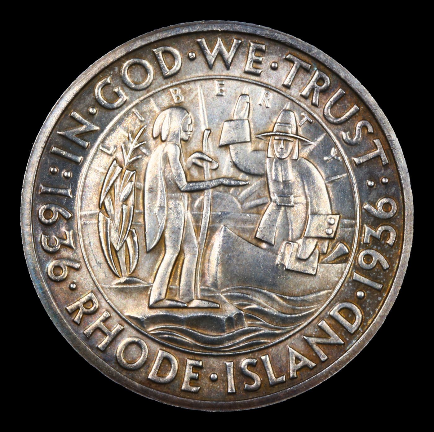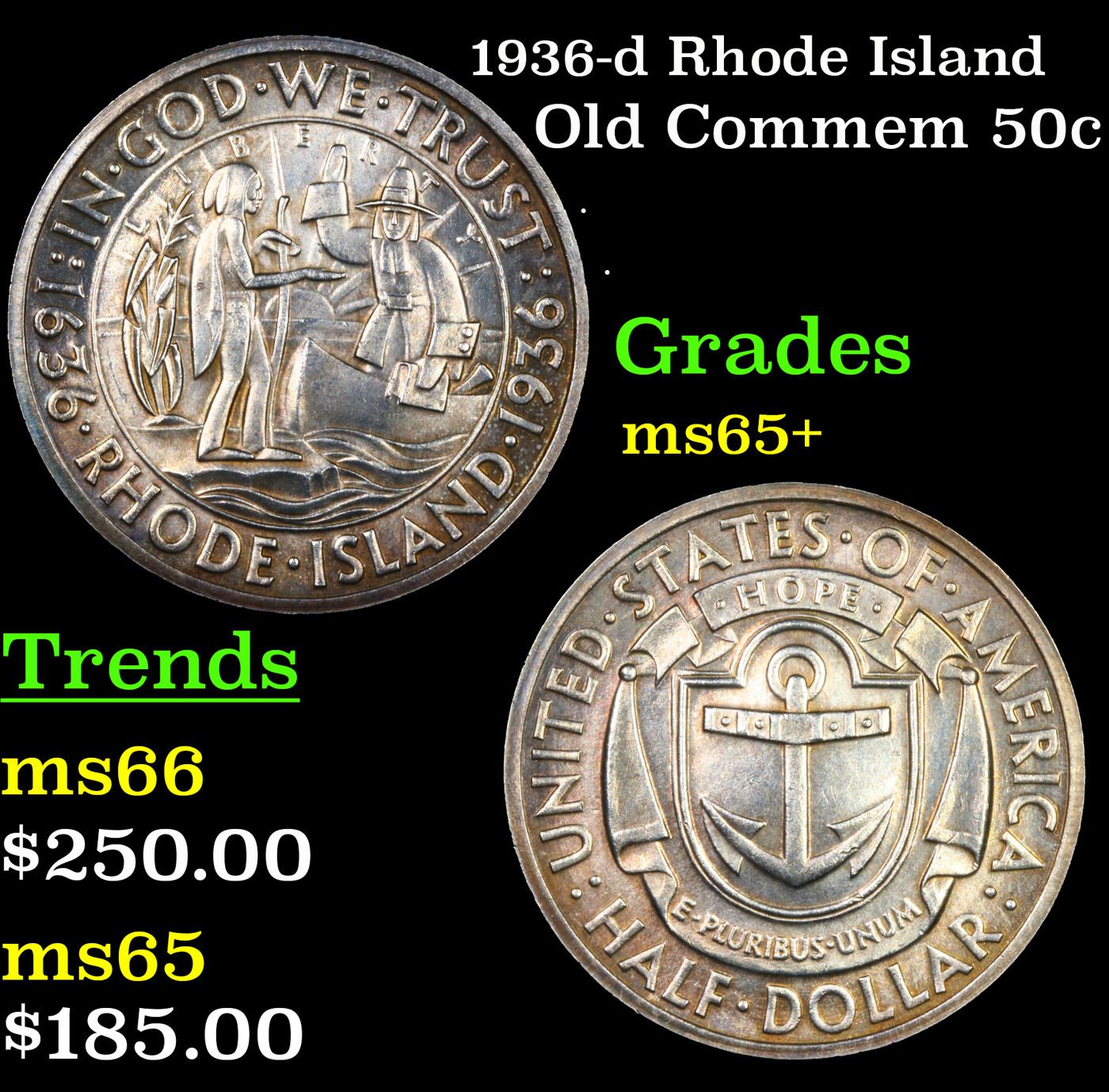 1936-d Rhode Island Old Commem Half Dollar 50c Grades GEM+ Unc. The commemorative coin most commonly referred to as the 1936 Rhode Island Tercentenary Half Dollar (Buy on eBay) was actually issued to mark the 300th anniversary of the founding of Providence by Roger Williams. The maximum authorized mintage was 50,000 pieces, of which the entire amount was produced across three mint facilities and distributed to the public.Designs for the coins were created by John Howard Benson and Arthur Graham Carey. Their original models did include reference to the Providence with inscriptions around the outer edge of the coin on the obverse “In a scene of God’s Merciful providence until me, called the place Providence” and on the reverse “State of Rhode Island and Providence Plantation Tercentenary”. These lengthy inscriptions were not used in the final version of the design.The obverse features a scene of John Williams in a canoe, holding a bible, and greeting a Native American who stands on the shore extending a hand. The “sun of religious liberty” appears in the background. The reverse design features an anchor and shield motif, adopted from the Rhode Island state seal. These designs were struck in low relief, but with sharply designed elements that resemble a woodcut.Including pieces struck for assay, the Philadelphia Mint produced 20,013, the Denver Mint 15,010, and the San Francisco Mint 15,011. The Rhode Island Half Dollars were issued for $1 each and said to have sold out quickly, however it was later suspected that some insiders held back portions of their allotments in order to sell them to the public at higher prices after the so-called sell out.Due to the nature of the design, contact marks may be prominent on the obverse and reverse. A small number of the coins are found with proof like surfaces, and these pieces command a premium.