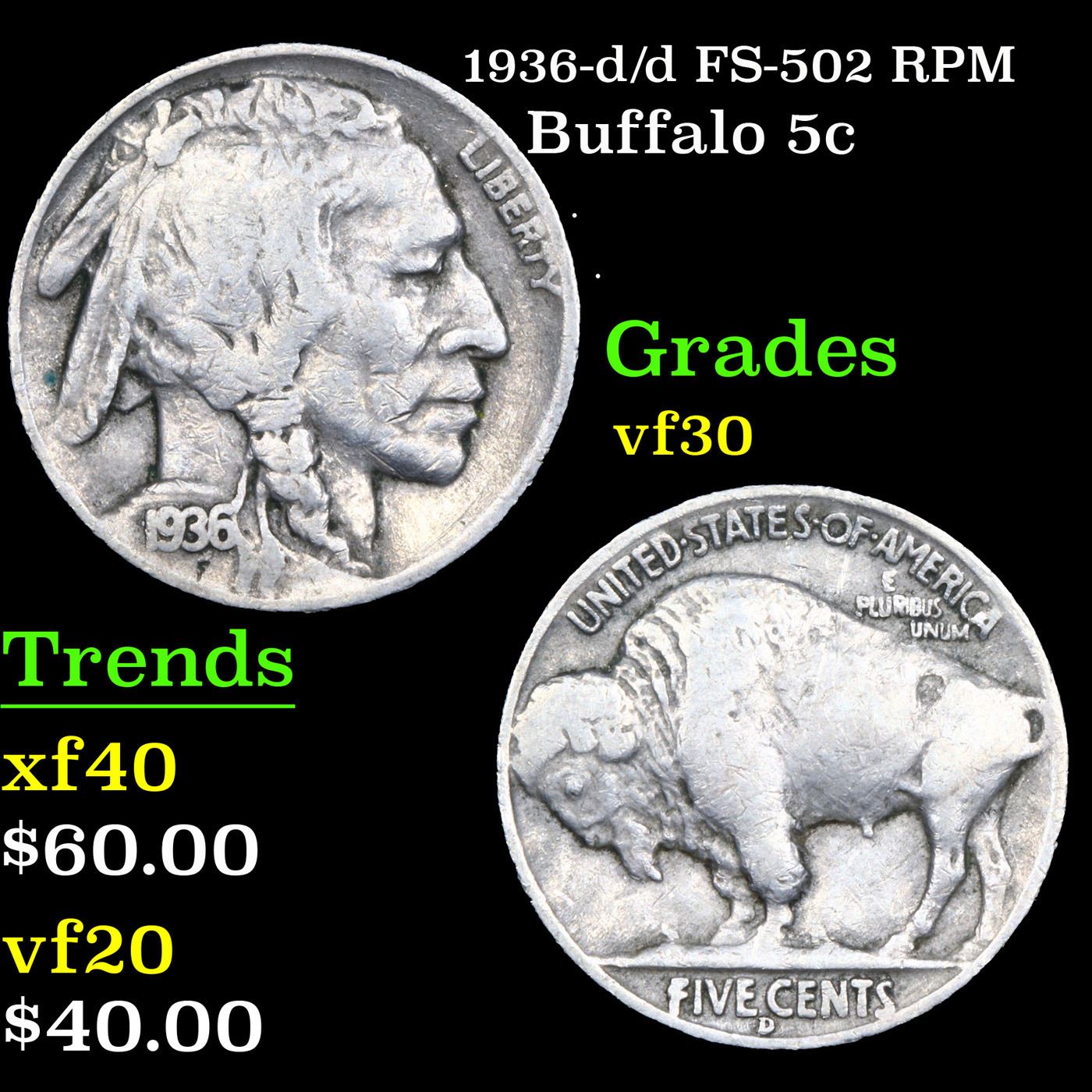 1936-d/d FS-502 RPM Buffalo Nickel 5c Grades vf++.