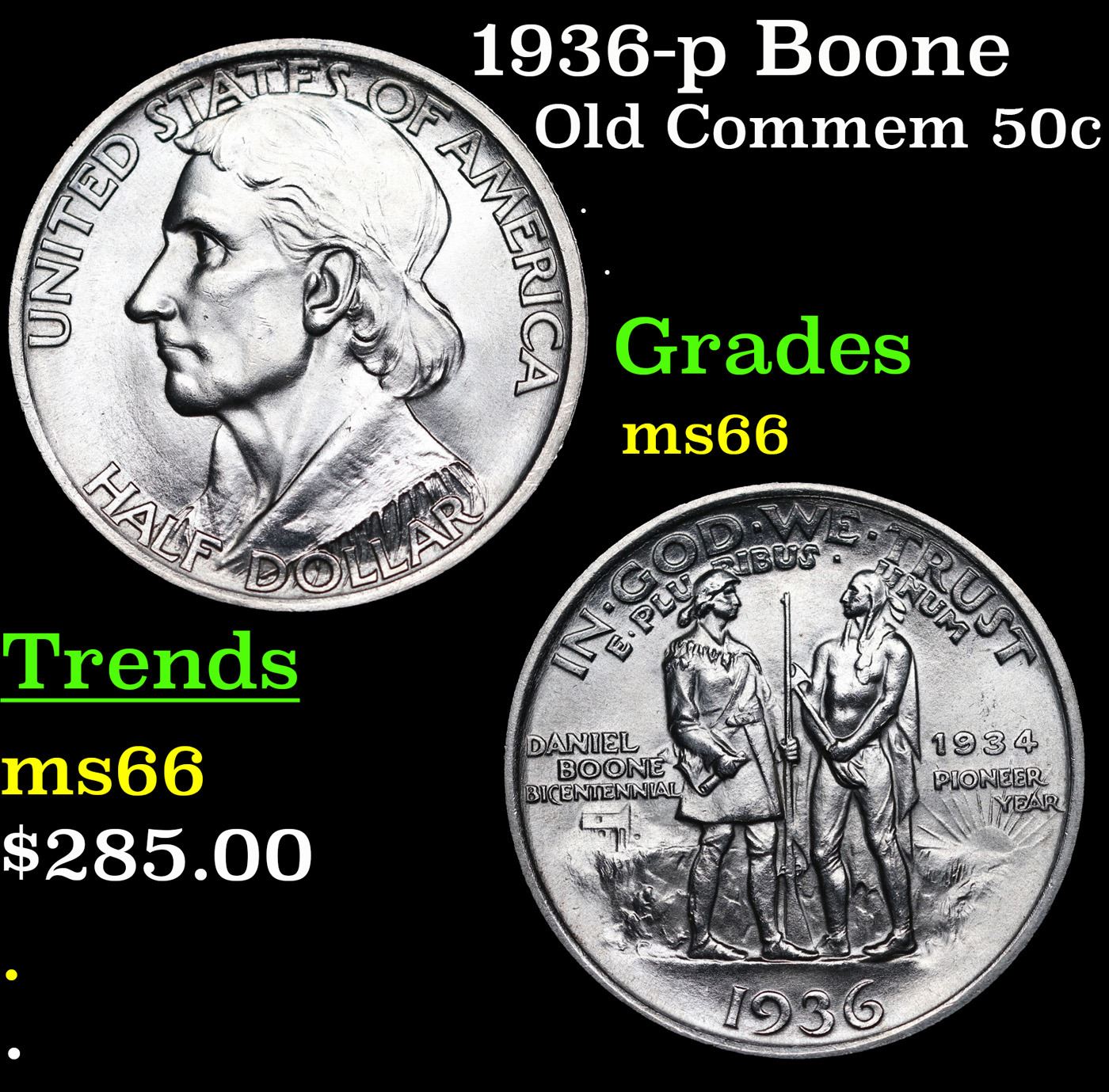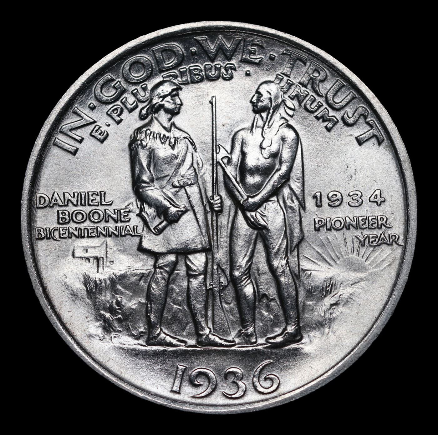 1936-p Boone Old Commem Half Dollar 50c Grades GEM+ Unc. The Daniel Boone Half Dollar was minted to celebrate the 200th anniversary of the birth of the famous frontiersman, explorer, and folk hero. Originally, the coins were struck at the Philadelphia Mint to coincide with the bicentennial year. During the next four years, the coins would continue to be struck, across three different mint facilities.On the obverse of the coin is a portrait of Daniel Boone. Since no known portraits of him exist, this is an artists conception created by Augustus Lukeman. The likeness looks decidedly different than the portrait of Boone, which had appeared on the previous 1921 Missouri Centennial Half Dollar. The reverse of the coin features a scene of the frontiersman holding a chart of Kentucky and a musket, facing an American Indian holding a tomahawk. In the background a blockhouse stockade and a sun with rays appear. This was also designed by Augustus Lukeman. Out of the maximum authorized mintage of 600,000 coins, there were only 10,007 of the 1934 Daniel Boone Half Dollars produced and sold at a price of $1.60 each. In the following year, additional coins were struck at the Philadelphia, Denver, and San Francisco Mints carrying the 1935 date. Subsequent to the initial distribution, legislation was passed in Congress stipulating that the original design should be supplemented by adding the bicentennial year “1934” to the reverse of the coin. A smaller number of coins were minted with the “small 1934 on reverse” and came to represent a scarce variety.More coins continued to be minted and issued in 1936, 1937, and 1938. The final two years would have smaller net distribution levels as collectors began to grow weary of the endless string of varieties of the commemorative coin, issued years after the actual bicentennial.