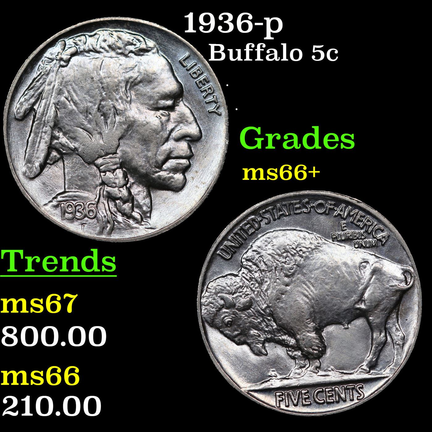 1936-p Buffalo Nickel 5c Graded ms66+ BY SEGS.