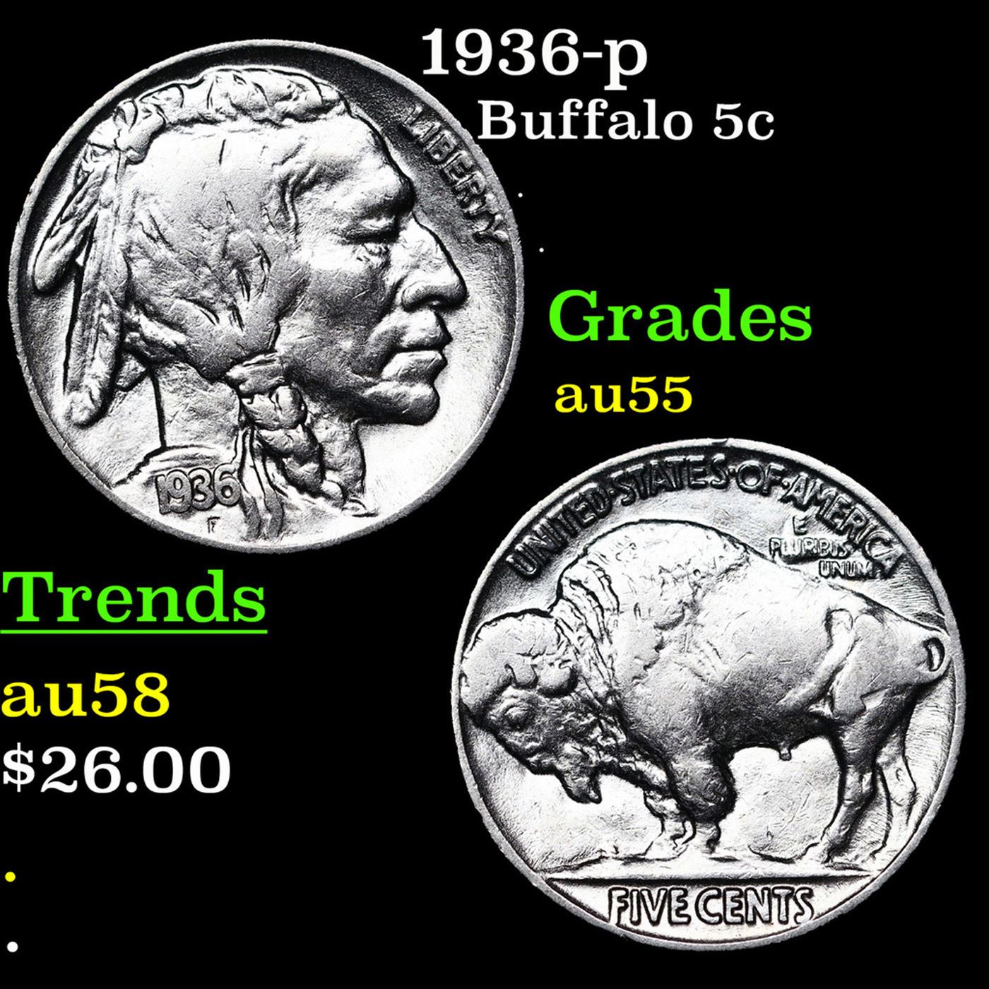 1936-p Buffalo Nickel 5c Grades Choice AU.