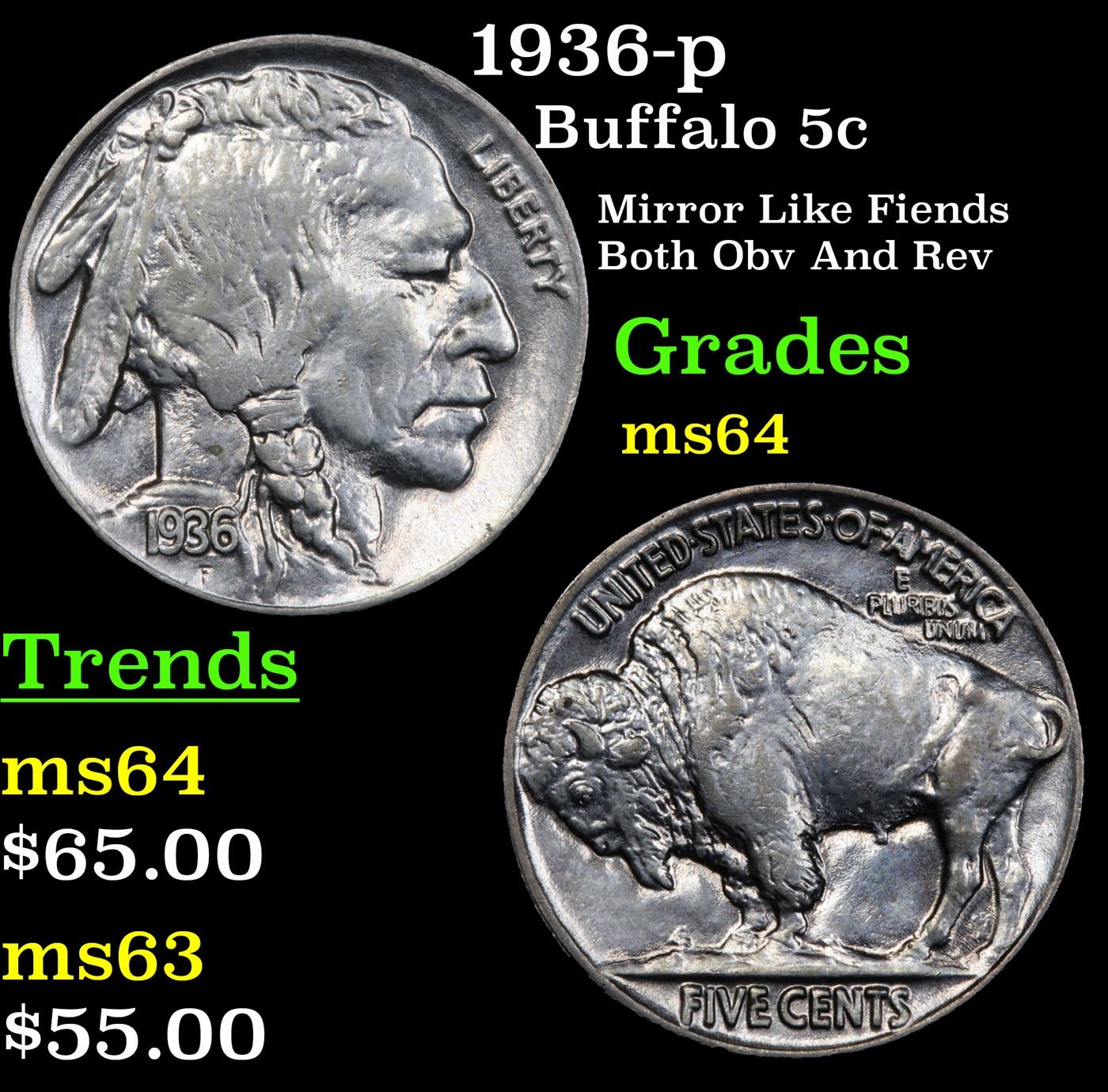 1936-p Buffalo Nickel 5c Grades Choice Unc.