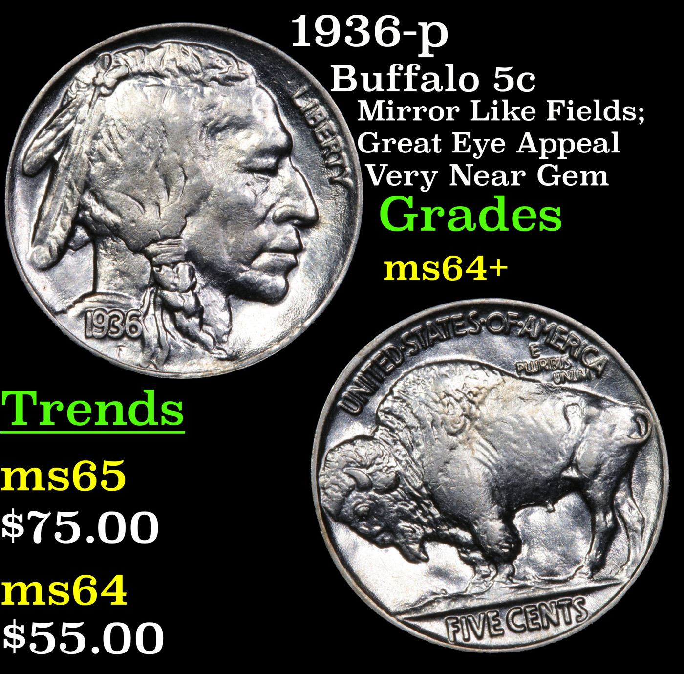 1936-p Buffalo Nickel 5c Grades Choice+ Unc.