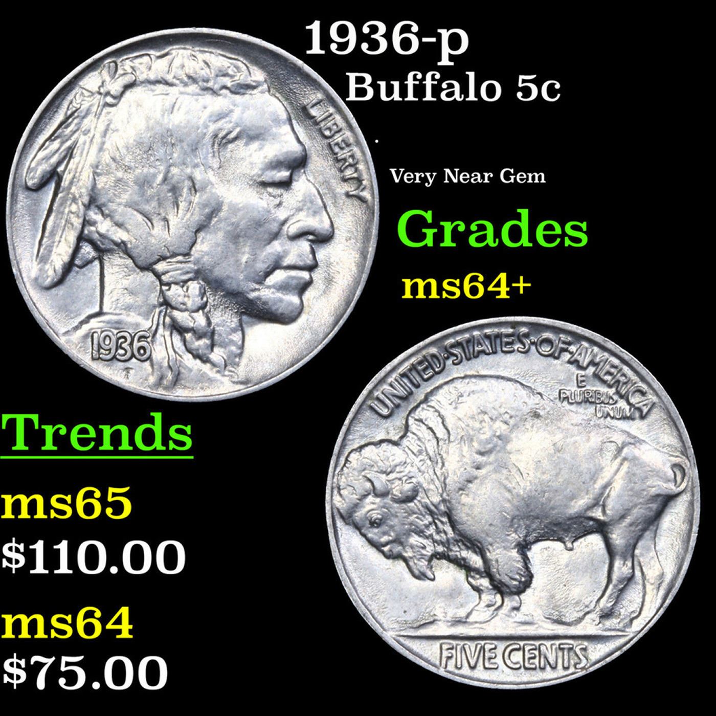 1936-p Buffalo Nickel 5c Grades Choice+ Unc.