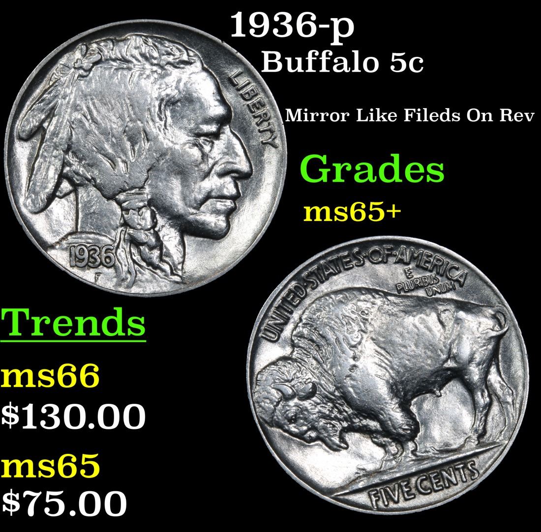 1936-p Mirror Like Fileds On Rev . Buffalo Nickel 5c Grades GEM+ Unc.