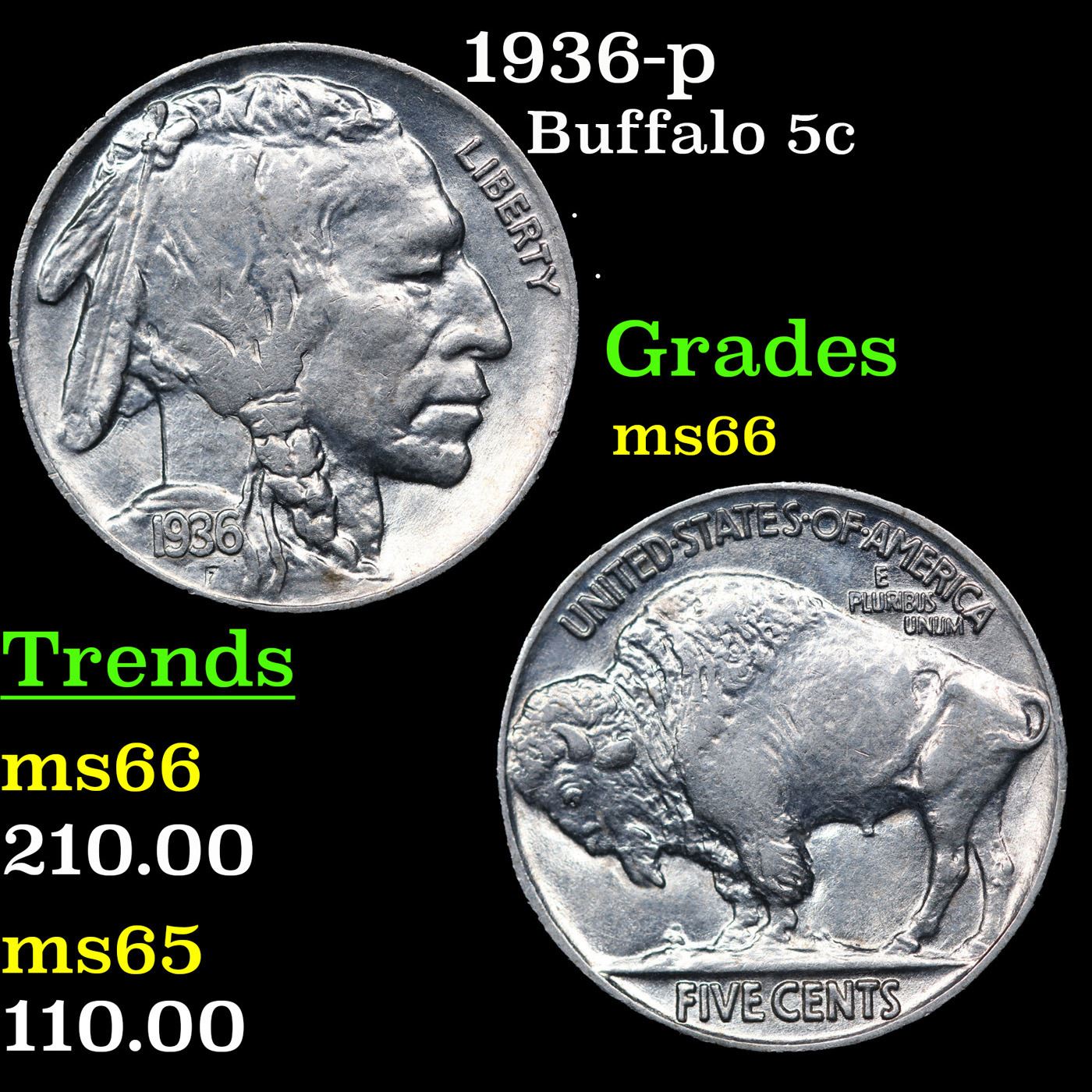 1936-p Buffalo Nickel 5c Grades GEM+ Unc.
