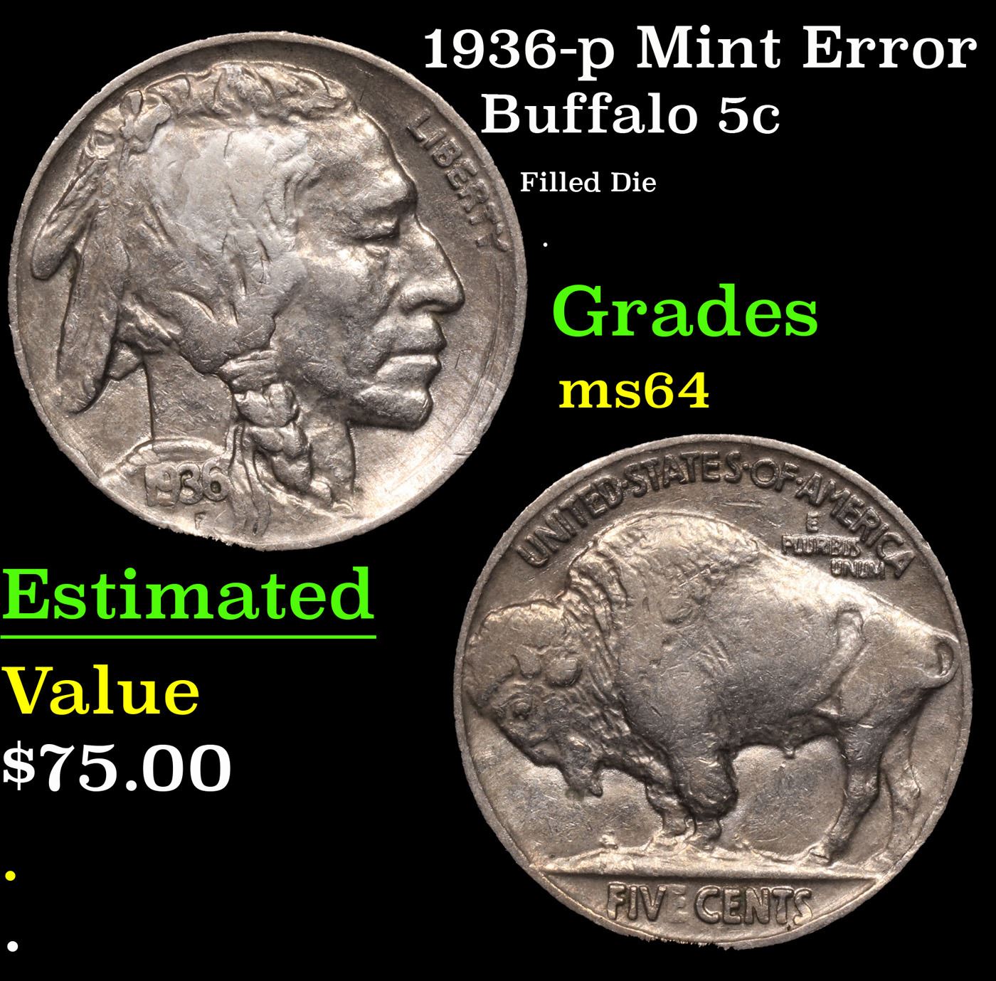 1936-p Mint Error Buffalo Nickel 5c Grades Choice Unc.