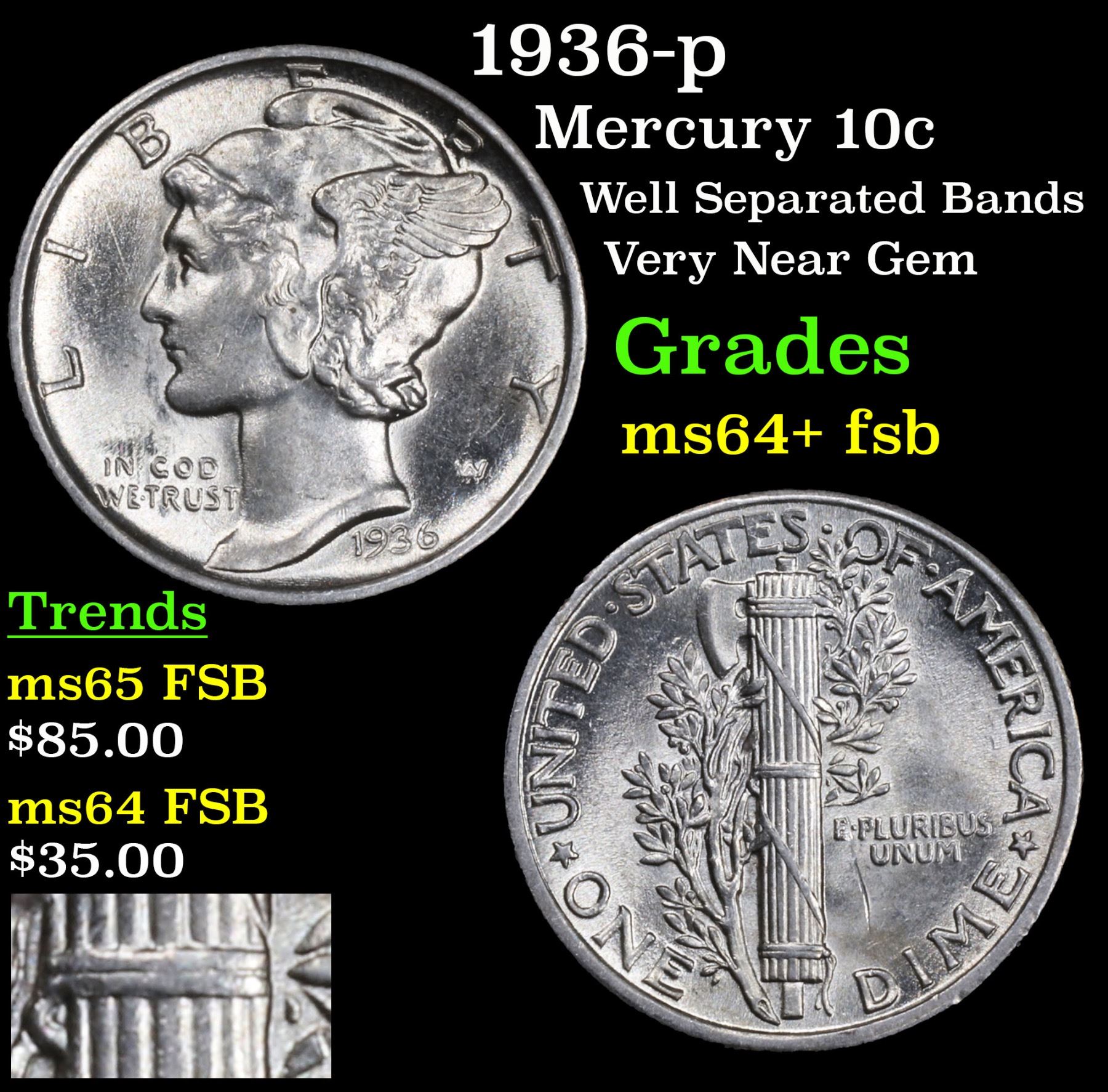 1936-p Mercury Dime 10c Grades Choice Unc+ FSB.