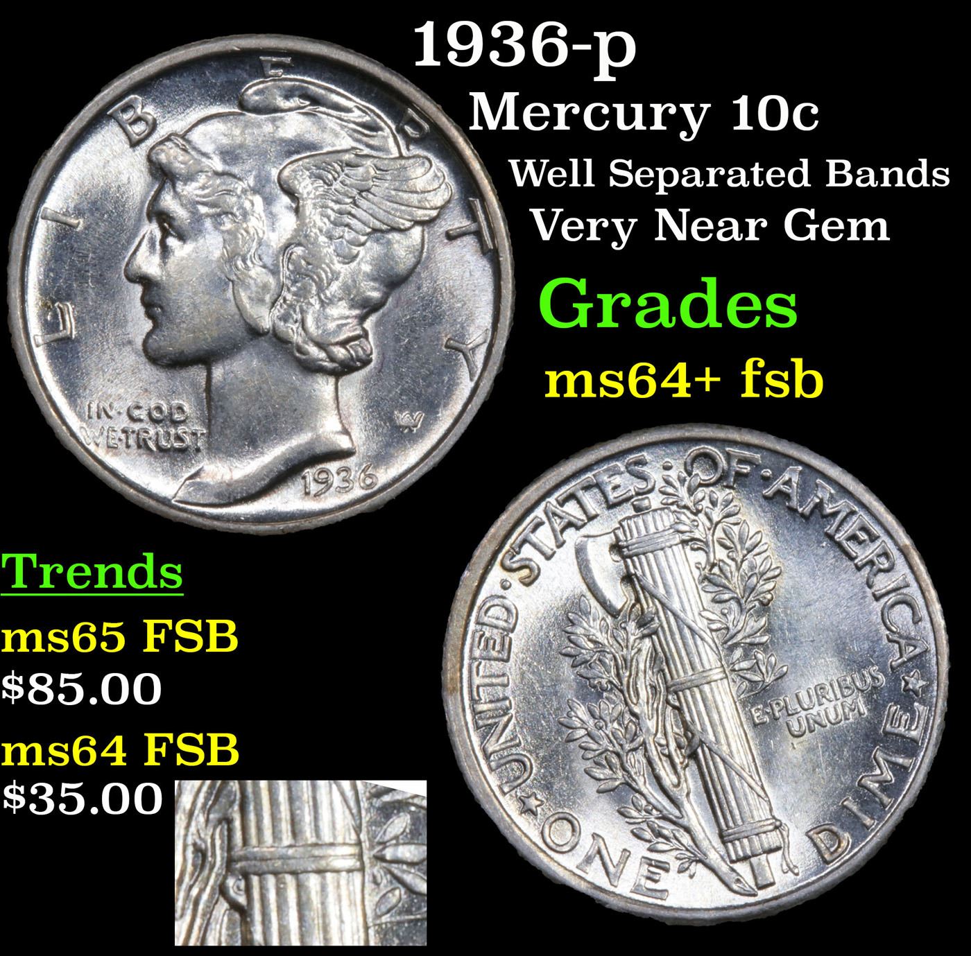 1936-p Mercury Dime 10c Grades Choice Unc+ FSB.
