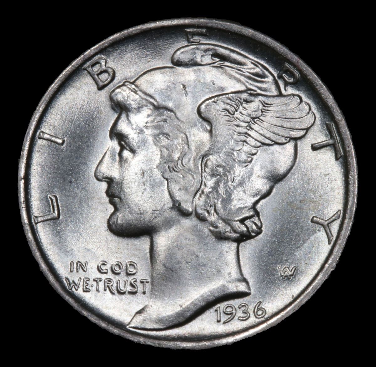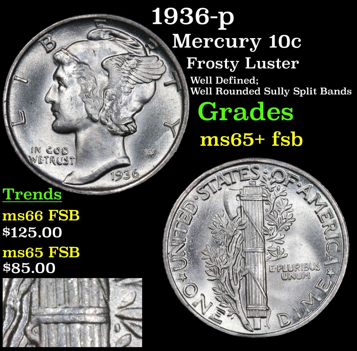 1936-p Frosty Luster Well Defined; Well Rounded Sully Split Bands Mercury Dime 10c Grades GEM+ FSB.