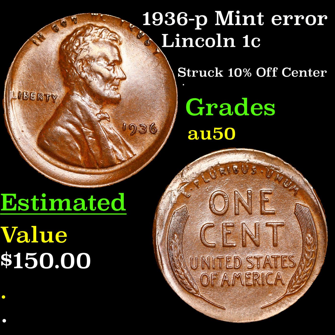 1936-p Mint error Lincoln Cent 1c Grades AU, Almost Unc