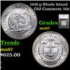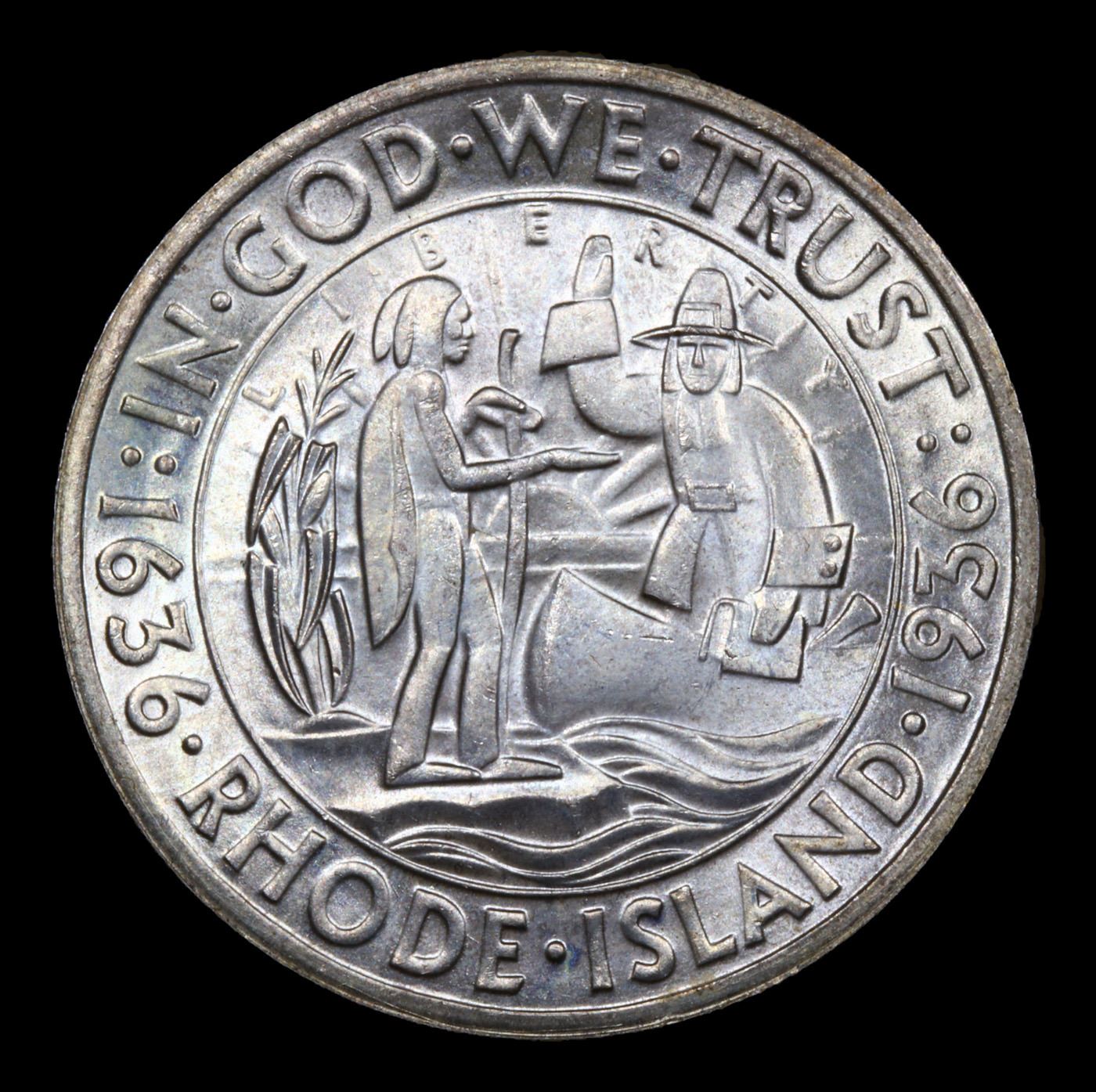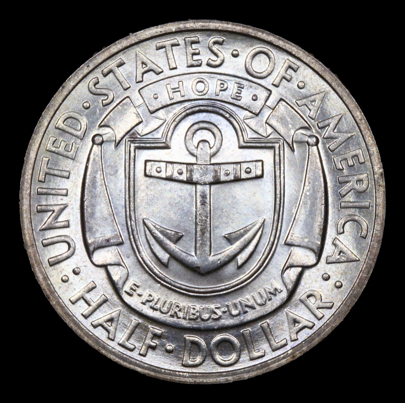 1936-p Rhode Island Old Commem Half Dollar 50c Graded ms67 By SEGS. The commemorative coin most commonly referred to as the 1936 Rhode Island Tercentenary Half Dollar (Buy on eBay) was actually issued to mark the 300th anniversary of the founding of Providence by Roger Williams. The maximum authorized mintage was 50,000 pieces, of which the entire amount was produced across three mint facilities and distributed to the public.Designs for the coins were created by John Howard Benson and Arthur Graham Carey. Their original models did include reference to the Providence with inscriptions around the outer edge of the coin on the obverse “In a scene of God’s Merciful providence until me, called the place Providence” and on the reverse “State of Rhode Island and Providence Plantation Tercentenary”. These lengthy inscriptions were not used in the final version of the design.The obverse features a scene of John Williams in a canoe, holding a bible, and greeting a Native American who stands on the shore extending a hand. The “sun of religious liberty” appears in the background. The reverse design features an anchor and shield motif, adopted from the Rhode Island state seal. These designs were struck in low relief, but with sharply designed elements that resemble a woodcut.Including pieces struck for assay, the Philadelphia Mint produced 20,013, the Denver Mint 15,010, and the San Francisco Mint 15,011. The Rhode Island Half Dollars were issued for $1 each and said to have sold out quickly, however it was later suspected that some insiders held back portions of their allotments in order to sell them to the public at higher prices after the so-called sell out.Due to the nature of the design, contact marks may be prominent on the obverse and reverse. A small number of the coins are found with proof like surfaces, and these pieces command a premium.