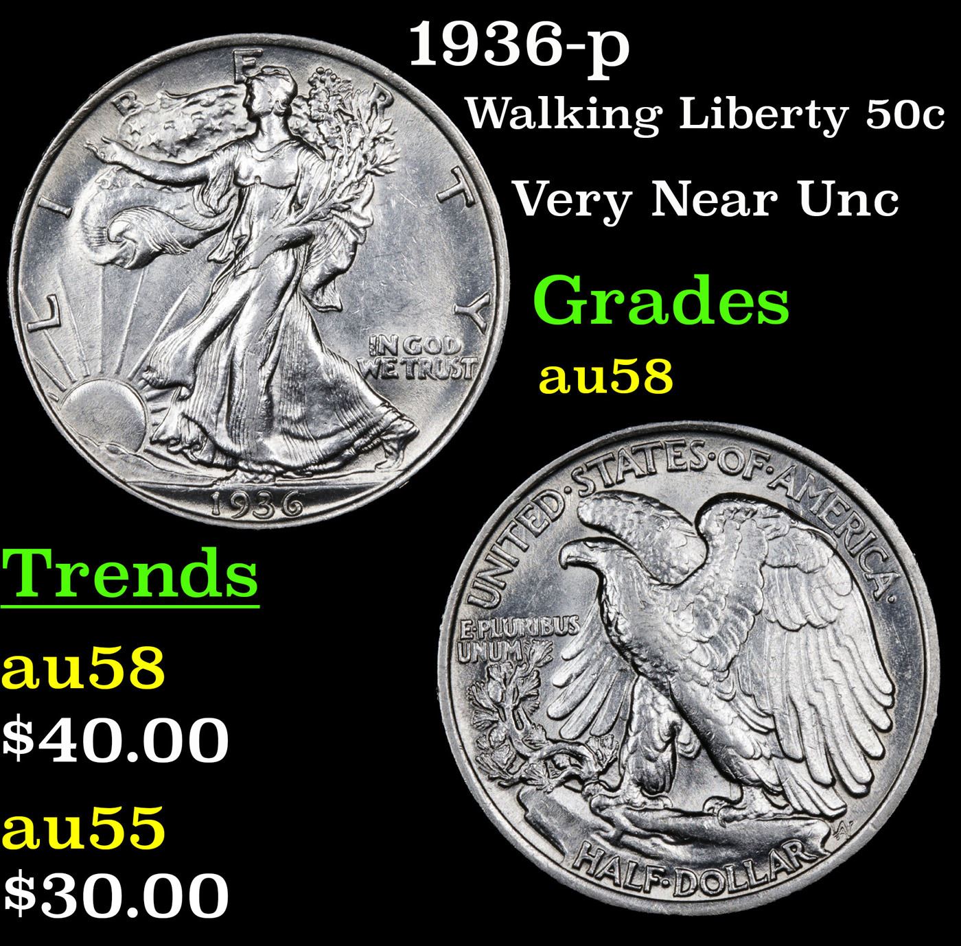 1936-p Walking Liberty Half Dollar 50c Grades Choice AU/BU Slider.