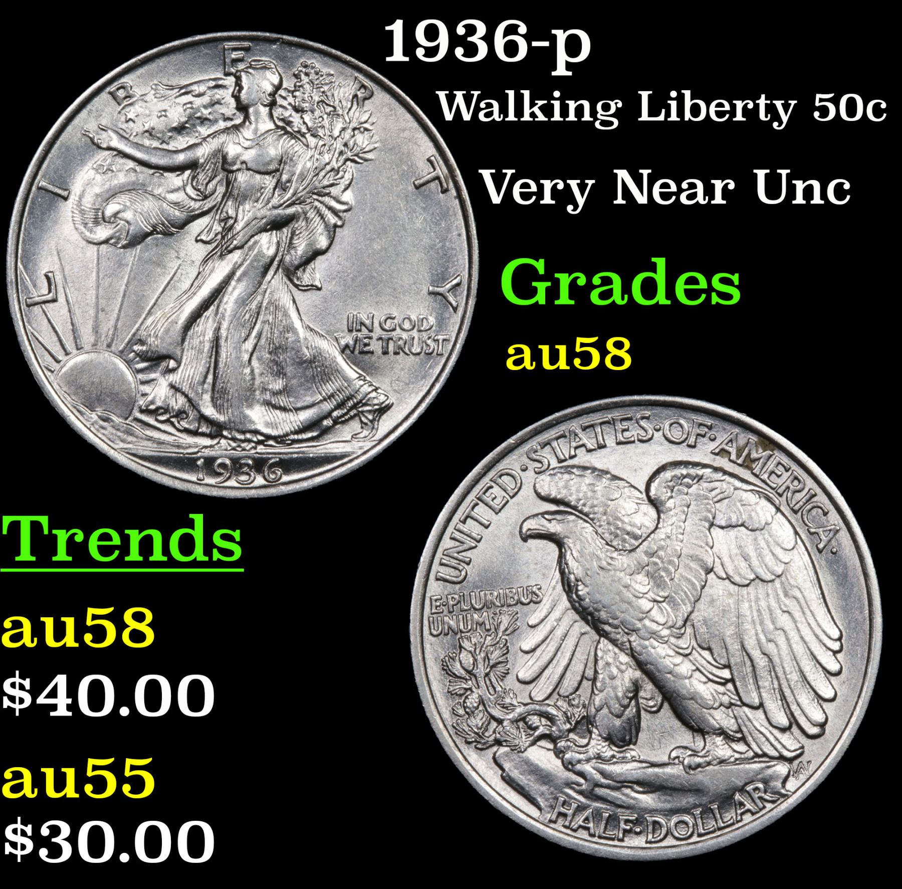 1936-p Walking Liberty Half Dollar 50c Grades Choice AU/BU Slider.
