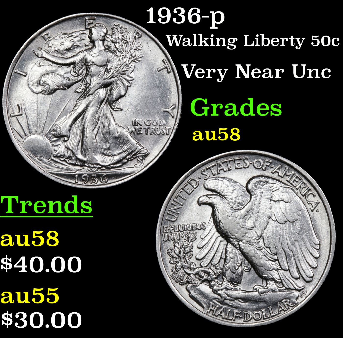 1936-p Walking Liberty Half Dollar 50c Grades Choice AU/BU Slider.