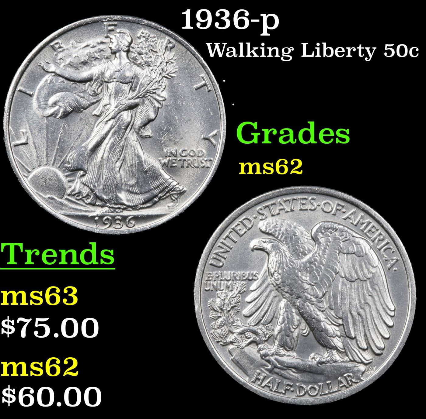 1936-p Walking Liberty Half Dollar 50c Grades Select Unc.