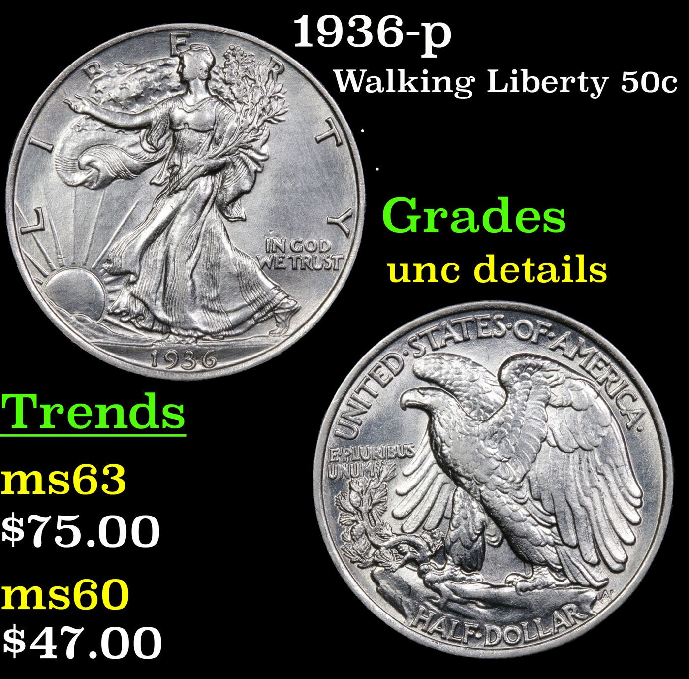 1936-p Walking Liberty Half Dollar 50c Grades Unc Details.