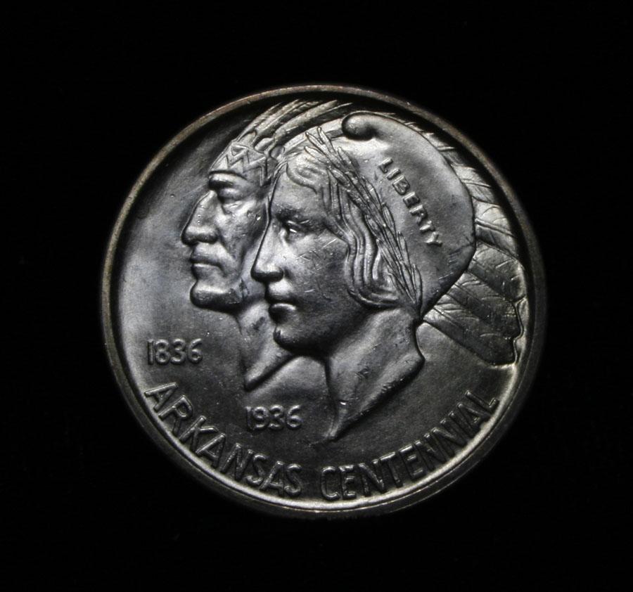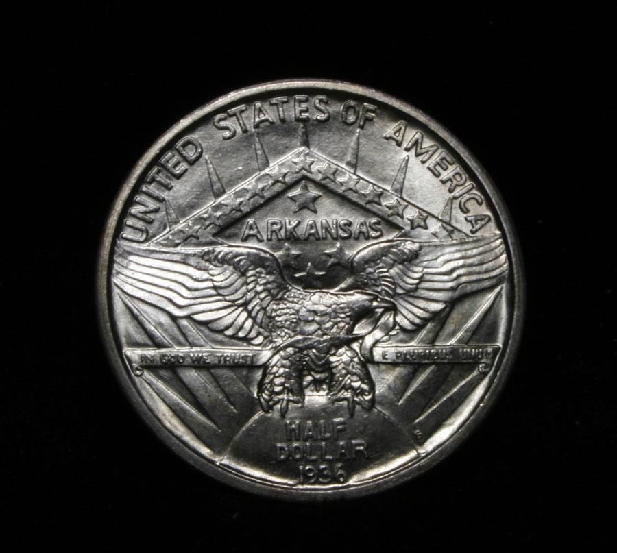This Choice Uncirculated example is Blast white and Fully Gradable. It has Great Luster and a great Strike. I will offer my personal buy back guarantee, that this coin is all original and will not come back Ungradeable by any major grading service. The Arkansas Commemorative was a much maligned commemorative, this issue is nowadays sought after as much as the others. The issue is generally weakly struck and has luster which looks more satin than bright. T When examining an Arkansas for wear check Miss Liberty’s cheek and wreath, also the eagle’s head and right wing, these are the high points. Coin World's Coin Values lists ms64 at $175 and The Wholesale Greysheet only lists it as a PDS set. Estimated Value $125