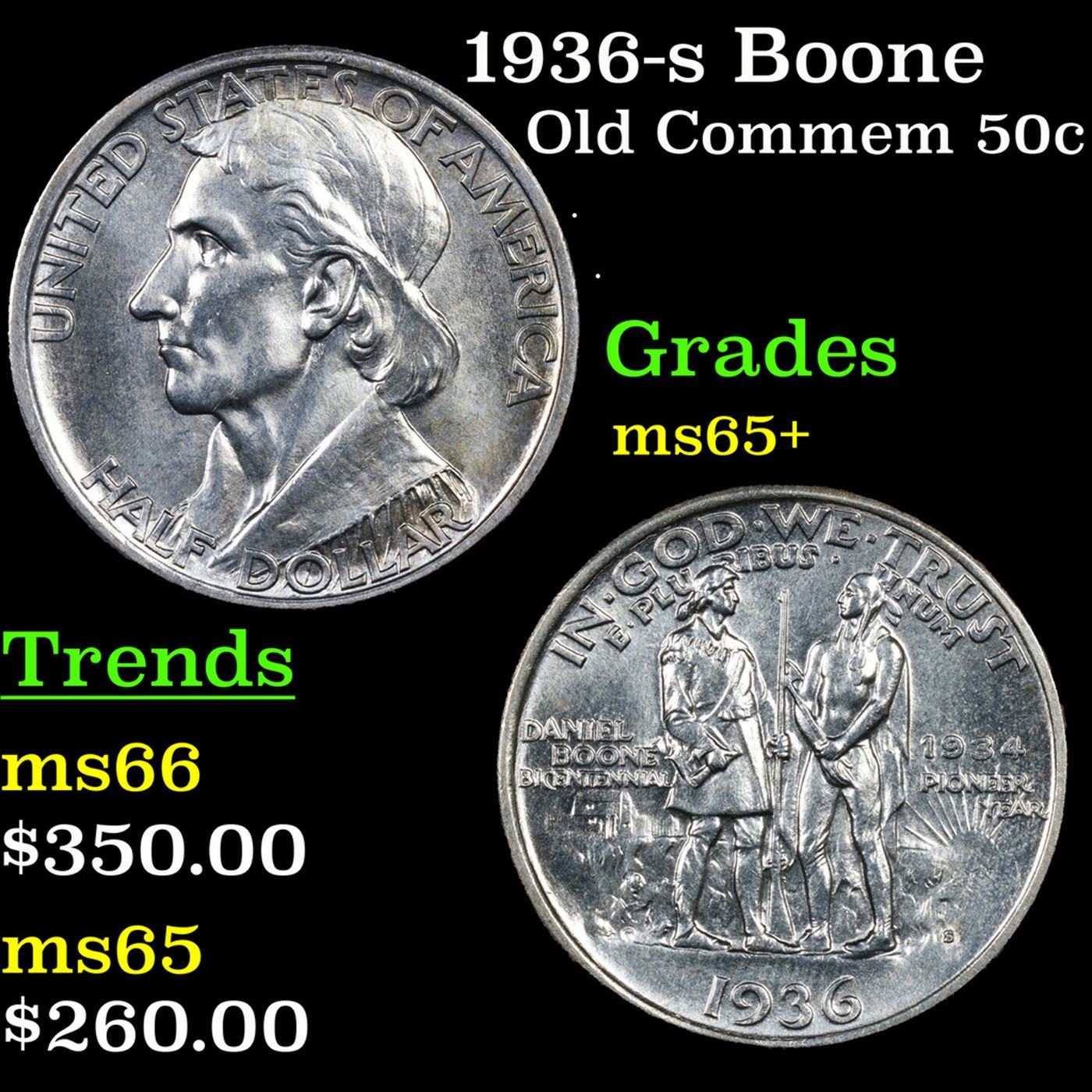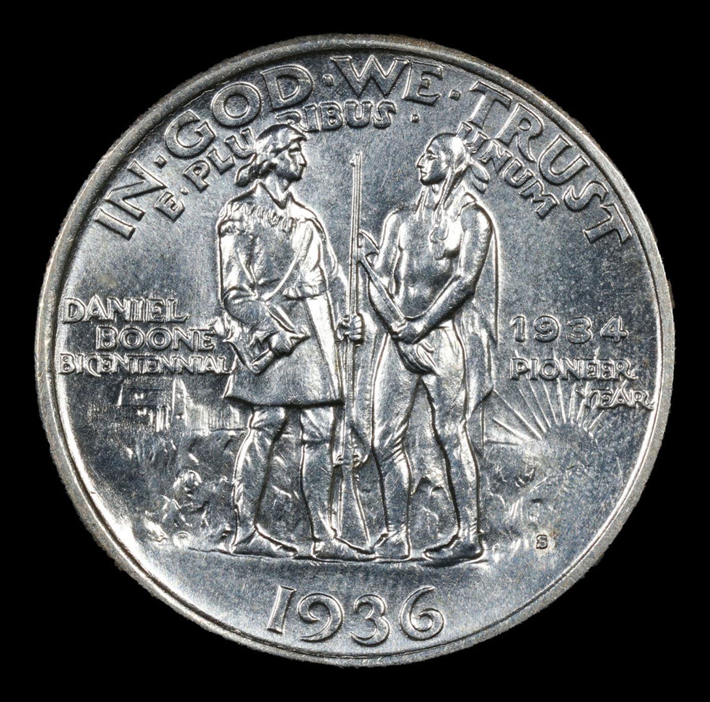1936-s Boone Old Commem Half Dollar 50c Grades GEM+ Unc. The Daniel Boone Half Dollar was minted to celebrate the 200th anniversary of the birth of the famous frontiersman, explorer, and folk hero. Originally, the coins were struck at the Philadelphia Mint to coincide with the bicentennial year. During the next four years, the coins would continue to be struck, across three different mint facilities.On the obverse of the coin is a portrait of Daniel Boone. Since no known portraits of him exist, this is an artists conception created by Augustus Lukeman. The likeness looks decidedly different than the portrait of Boone, which had appeared on the previous 1921 Missouri Centennial Half Dollar. The reverse of the coin features a scene of the frontiersman holding a chart of Kentucky and a musket, facing an American Indian holding a tomahawk. In the background a blockhouse stockade and a sun with rays appear. This was also designed by Augustus Lukeman. Out of the maximum authorized mintage of 600,000 coins, there were only 10,007 of the 1934 Daniel Boone Half Dollars produced and sold at a price of $1.60 each. In the following year, additional coins were struck at the Philadelphia, Denver, and San Francisco Mints carrying the 1935 date. Subsequent to the initial distribution, legislation was passed in Congress stipulating that the original design should be supplemented by adding the bicentennial year “1934” to the reverse of the coin. A smaller number of coins were minted with the “small 1934 on reverse” and came to represent a scarce variety.More coins continued to be minted and issued in 1936, 1937, and 1938. The final two years would have smaller net distribution levels as collectors began to grow weary of the endless string of varieties of the commemorative coin, issued years after the actual bicentennial.