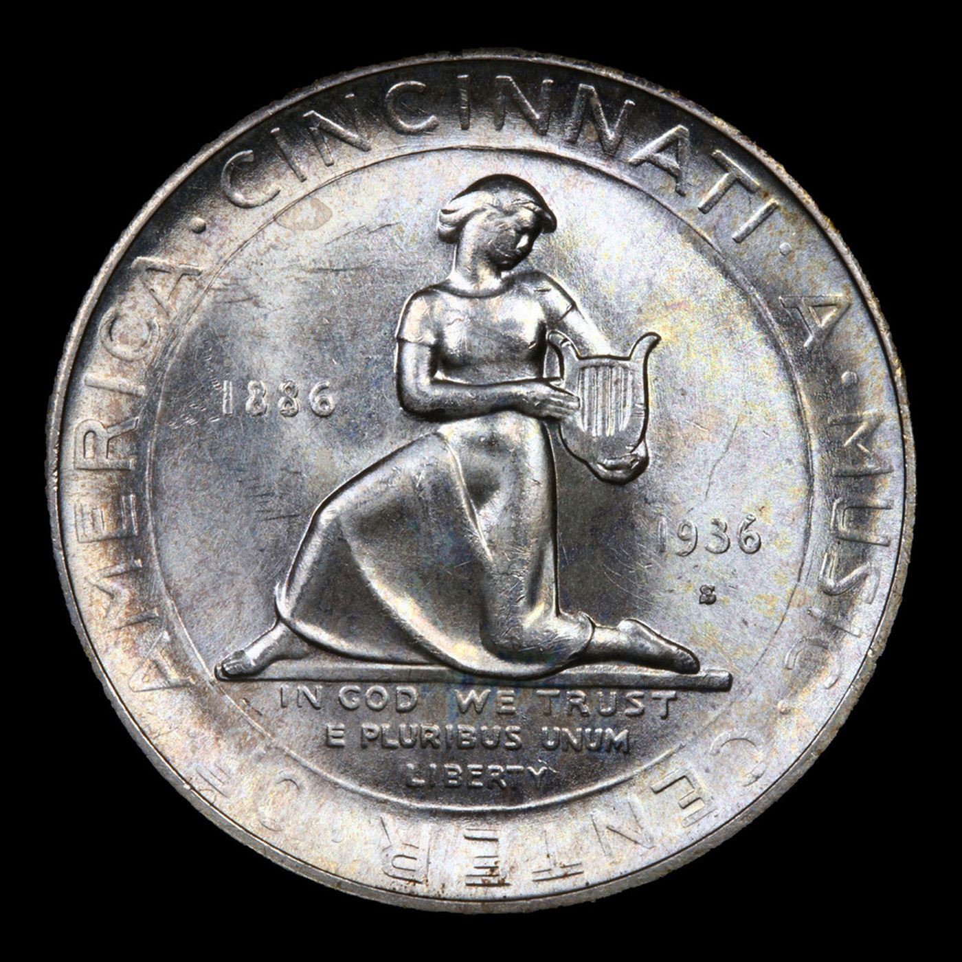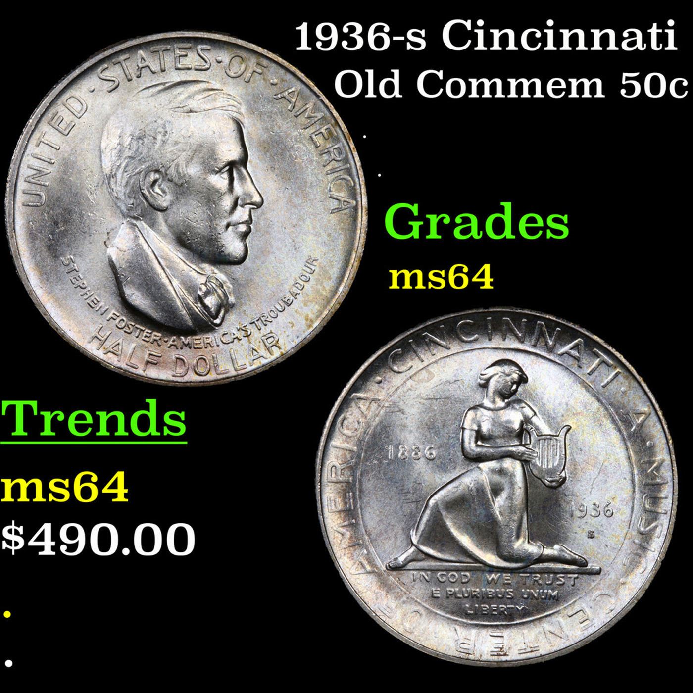 1936-s Cincinnati Old Commem Half Dollar 50c Grades Choice Unc. The 1936 Cincinnati Music Center Half Dollar is often cited as one of the early commemorative coins issued for a topic questionable historical significance and primarily for the profit of an enthusiastic promoter. Officially, the coins were authorized to commemorate “the fiftieth anniversary of Cincinnati, Ohio, as a center of music, and its contribution to the art of music for the past fifty years.”The obverse design features an image of Stephen Foster, an important American composer of his era, known for songs such as “Oh! Susanna”, “Camptown Races”, and “My Old Kentucky Home”. The reverse features a female figure holding a lyre, intended to personify music. When the designs were sent to the the Commission of Fine Arts for approval, they raised series issues about the design and legitimacy of the commemorative coin issue. They could not find anyone in music circles who knew about the proposed coin. They also presented information showing that the city’s leadership in music could be traced back to 1873, with the May Festival Association organized by George Ward Nichols. The date 1886, which was included on the coin, carried no particular significance. Stephen Foster, who appeared on the obverse of the coin, had no role in the movement in Cincinnati, but only lived there briefly while he was a bookkeeper.Despite these reservations and the CFA’s outright rejection of the designs, the coins were ultimately issued at their maximum authorized mintage of 15,000 pieces plus additional examples for assay. The production was divided equally between the Philadelphia, Denver, and San Francisco Mint facilities, resulting in extremely low mintages.The coins were offered at $7.75 for a complete set of three coins, which represented the highest initial pricing for a silver commemorative to date. Very few coins were actually purchased at this price, as the entire mintage was quickly announced as sold out. It is believed that many of the sets were placed with insiders or those close to the issuer, who began offering them for sale at significantly higher prices following the “sell out.”